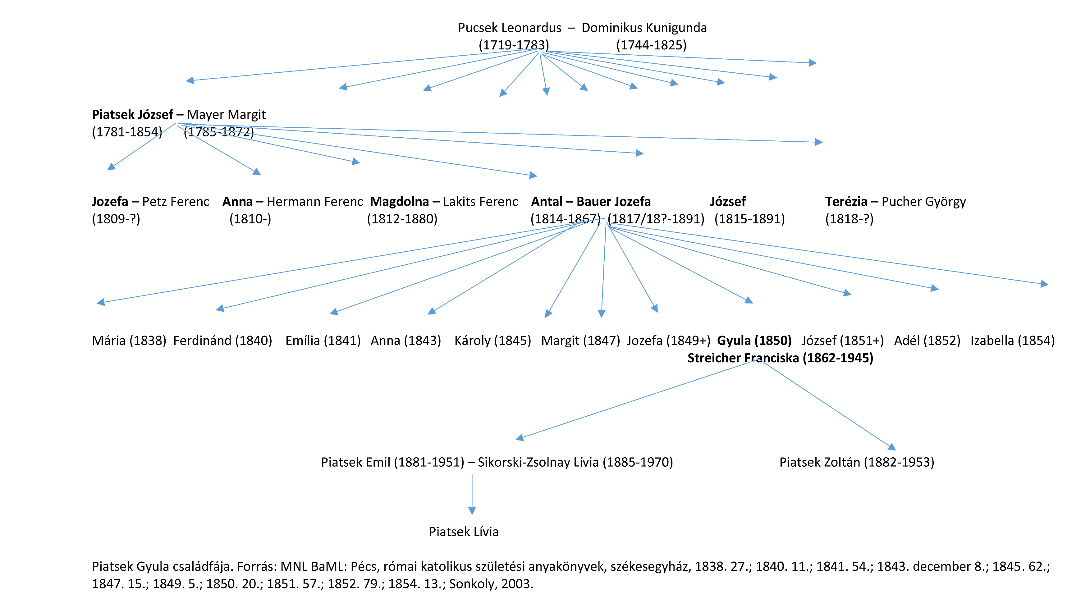 1. ábra: Piatsek Gyula családfája. A családnév több változatban (Pucsek, Picsek, Pőcsek stb.) is előfordul a forrásokban, és még a 19. század második felében is többféleképpen (Piacsek, Piatsek, Piátsek) írták. Mivel Gyula a tervrajzain Piátsek-ként írta alá a nevét, ezért az ő esetében ezt az írásmódot alkalmazzuk.