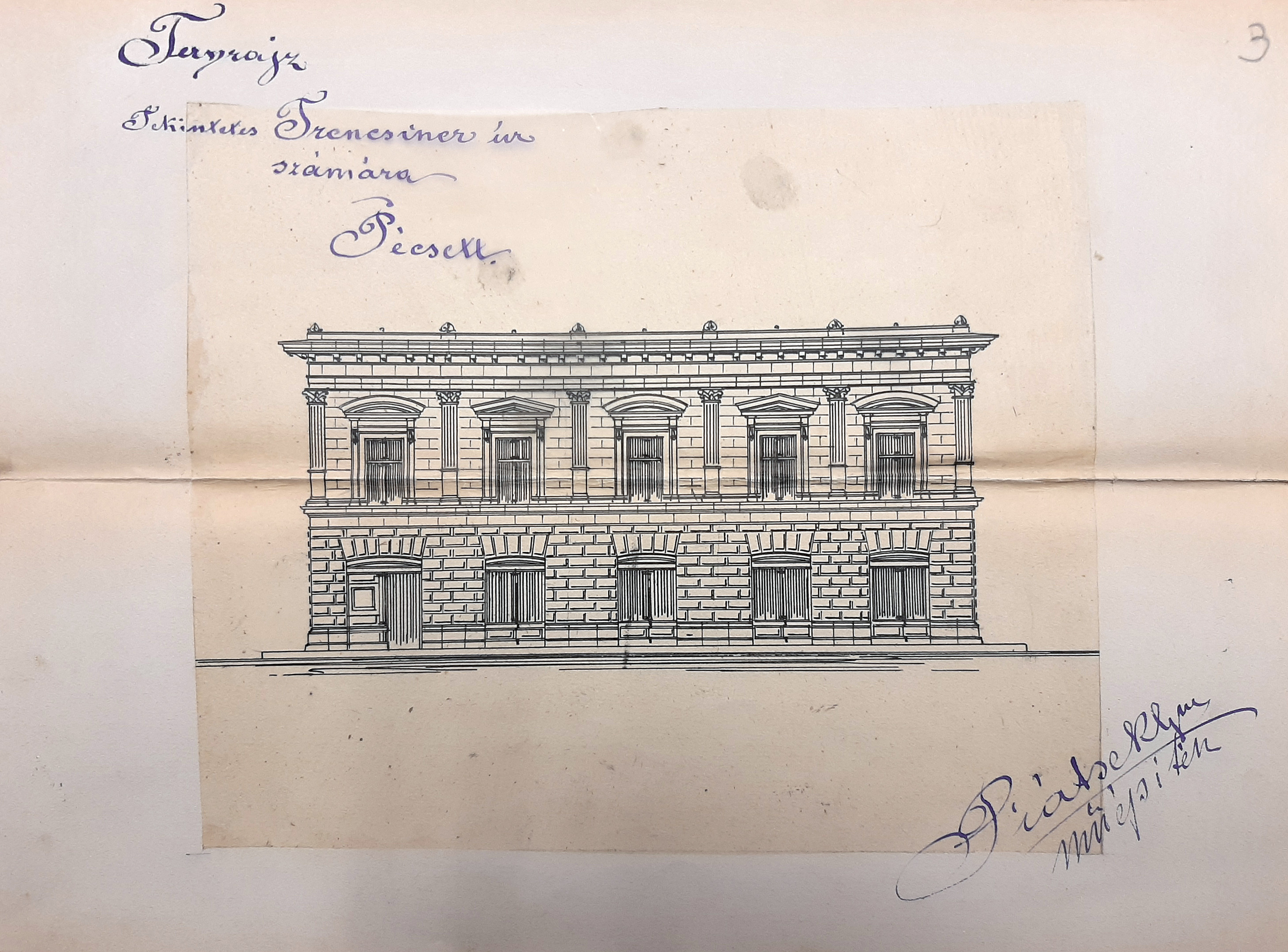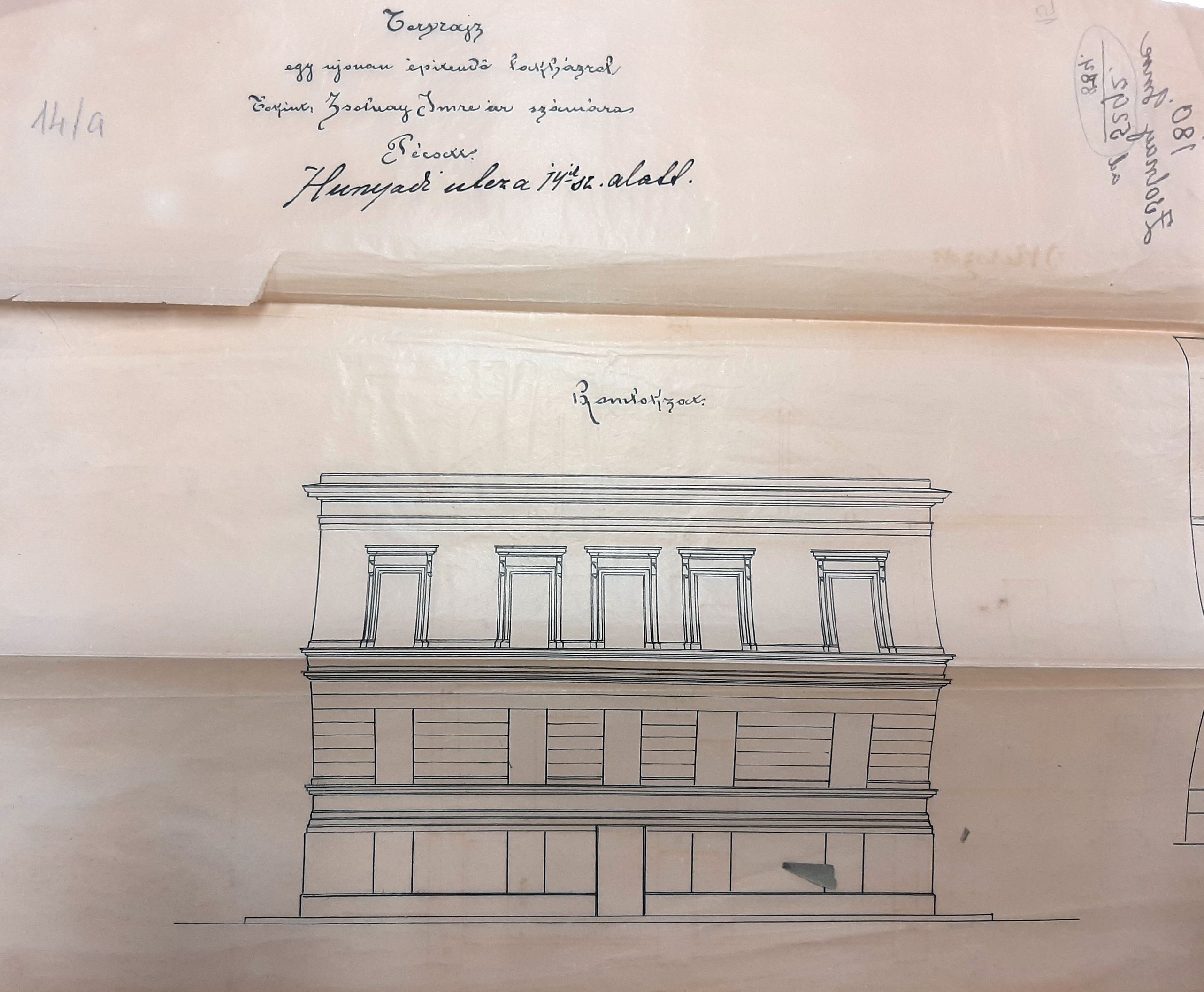 - ábra: Zsolnay Imre kereskedő háza, Hunyadi (ma Mátyás király) u. 14. BaML: IV. 1406. b. 5859/1884.