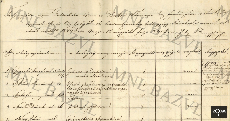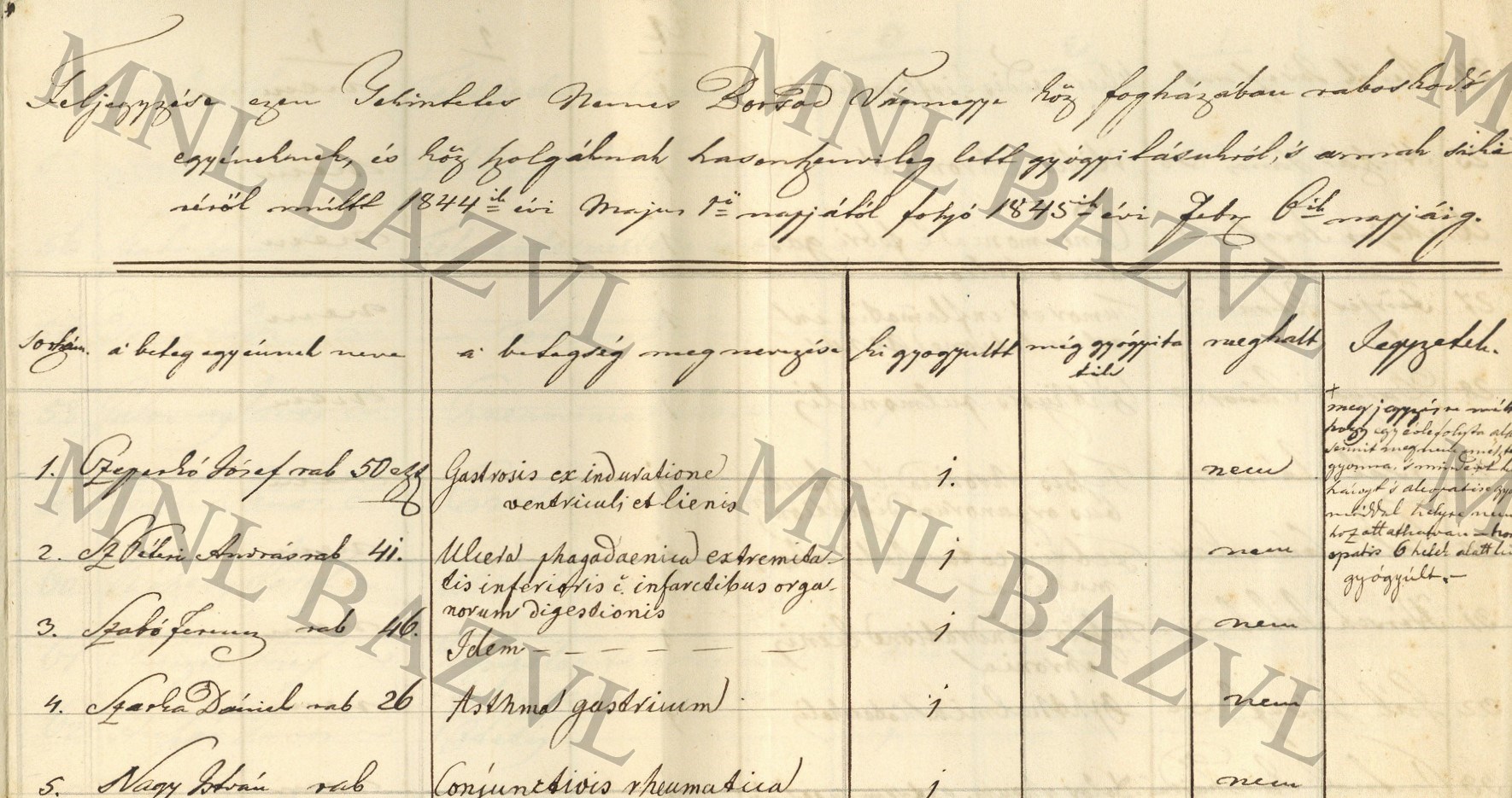 „Tekintetes Nemes Vármegye! Múlt 1844 évi böjtelő hava[13] 17-én hozott és ide alá zárt kegyes határozat folytában alul írtnak engedelme lévén a tekintetes megyeházánál hasonszenvileg gyógyítási rendszert használva egy kórházat alakítani, annak azon időtől mint lett működéséről jelentés tétel kötelességembe lévén, alázatos tisztelettel van szerencsém benyújtani. A melléklet alatti hiteles fejezést, melyből kitetszik, hogy múlt évi május elseje napjától folyó évi böjtelő hava hatodik napjáig kik s mi módon s milyen sikerrel használták hasonszenvi gyógymódomat. A melléklet alatti jegyzékből bebizonyosodik, miképpen e kevés idő alatt 99 raboskodók és közszolgák élvezték, még pedig veszedelmes nyavalyákban gyógymódomat és igen számosok kik minden siker nélkül használták már a régi allopátiás gyógymódot is. Istennek hála ezek közül felügyeletem alatti kórházban egy sem halálozott meg, kivéve raboskodó Faina Józsefet, ki végső vonaglásai között, midőn már nyelni sem tudott, hozatván a hasonszenvi kórházba a nélkül, hogy szereimmel egyszer is élhetett volna, meghalálozott.