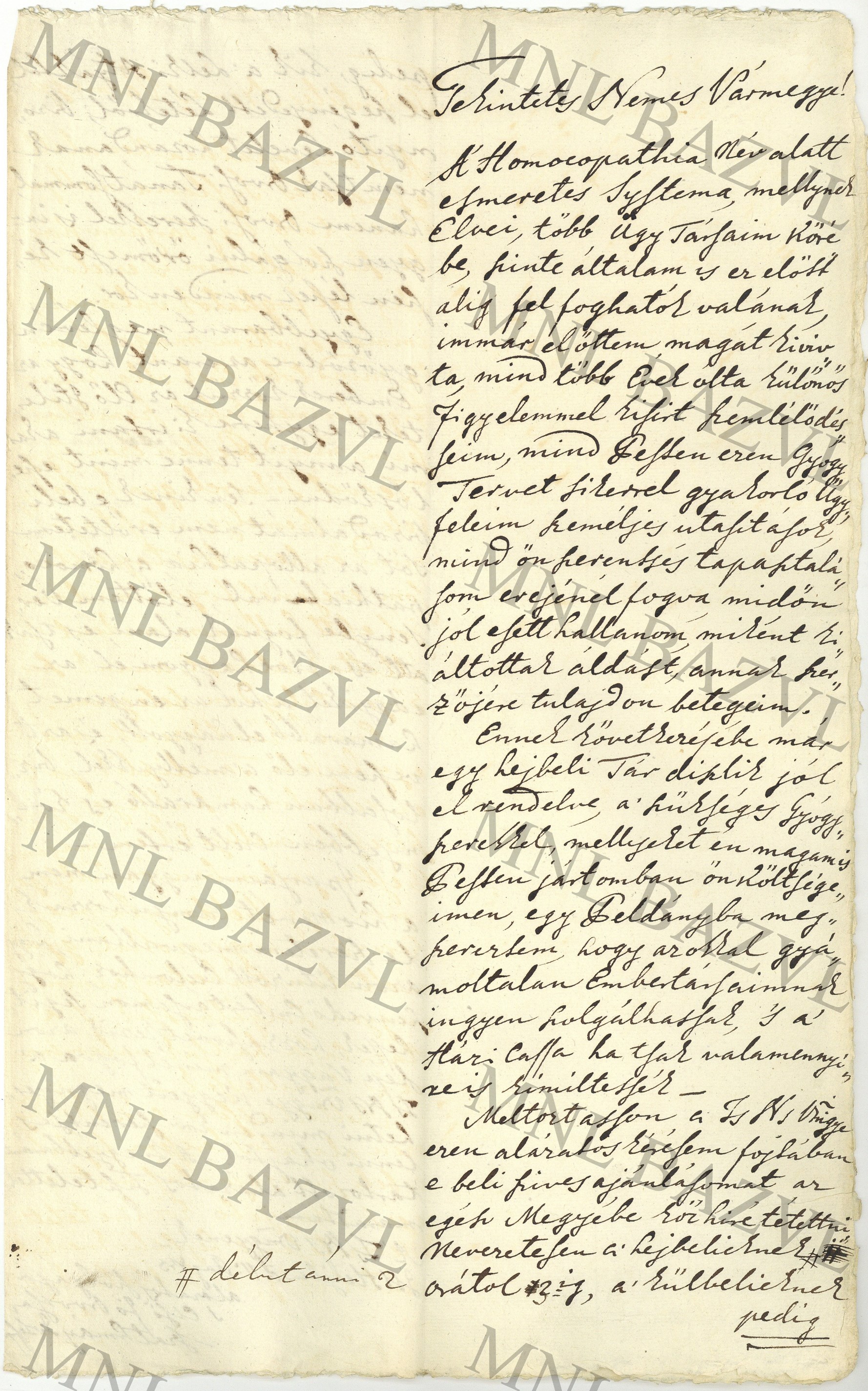 „Tekintetes Nemes Vármegye! A homeopátia név alatt ismeretes szisztéma, melynek elvei több ügytársaim körében, szinte általam is ezelőtt alig felfoghatók valának, immár előttem magát kivívta, mint több évek óta különös figyelemmel kísért szemlélődéseim, mint Pesten ezen gyógytervet sikerrel gyakorló ügyfeleim személyes utasítások, midőn szerencsés tapasztalásom erejénél fogva, midőn jól esett hallanom, miként kiáltottak áldást annak szerzőjére tulajdon betegeim.