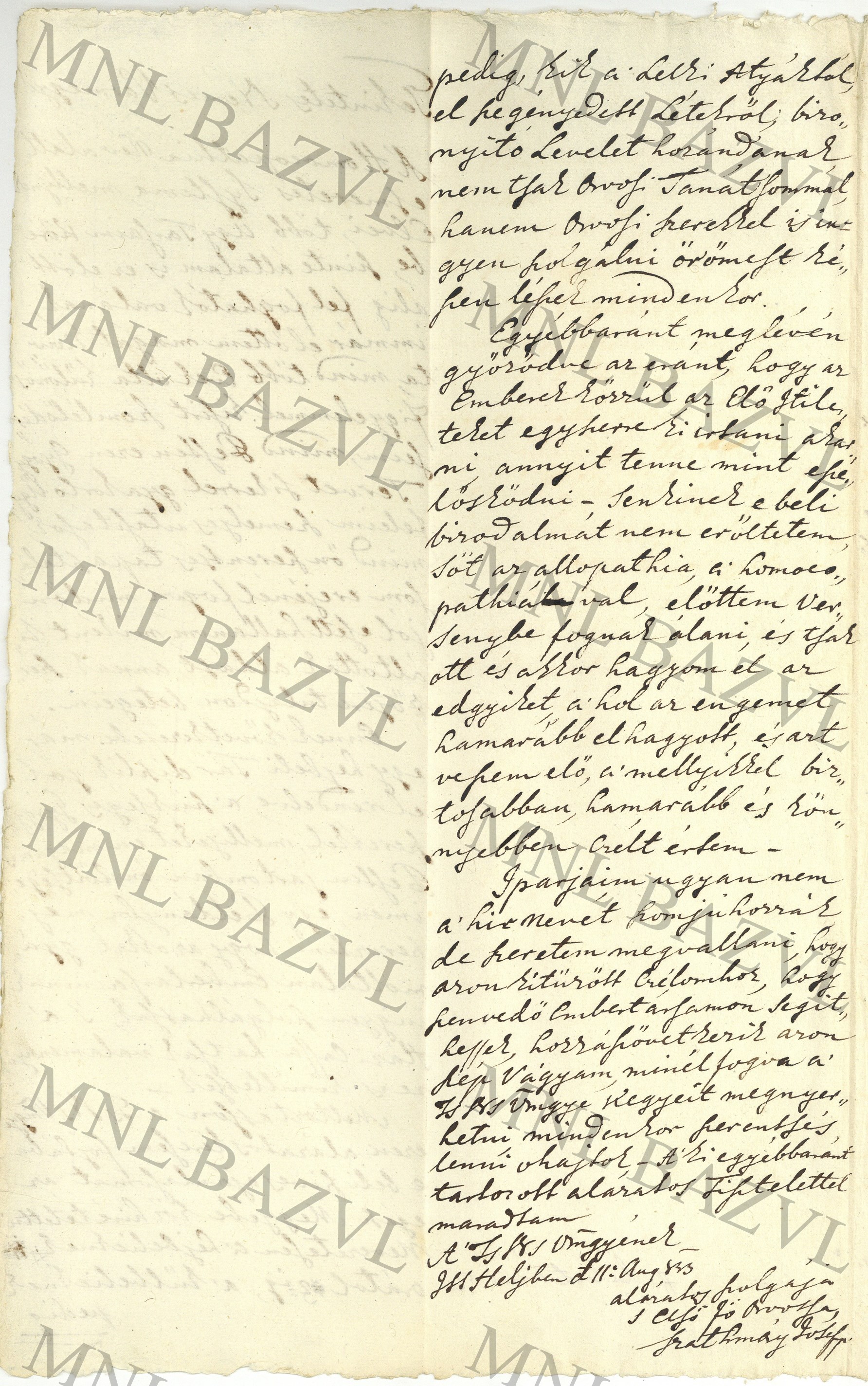 Egyébiránt meg lévén győződve az iránt, hogy az emberek közül az előítéleteket egyszerre kiirtani akarni annyit tenne, mint eszelősködni. Senkinek ebbeli bízodalmát nem erőltetem, sőt az allopátia a homeopátiával előttem versenyben fognak állni, és csak ott és akkor hagyom el az egyiket, ahol az engemet hamarabb elhagyott és azt veszem elő amelyikkel biztosabban, hamarabb és könnyebben célt értem.