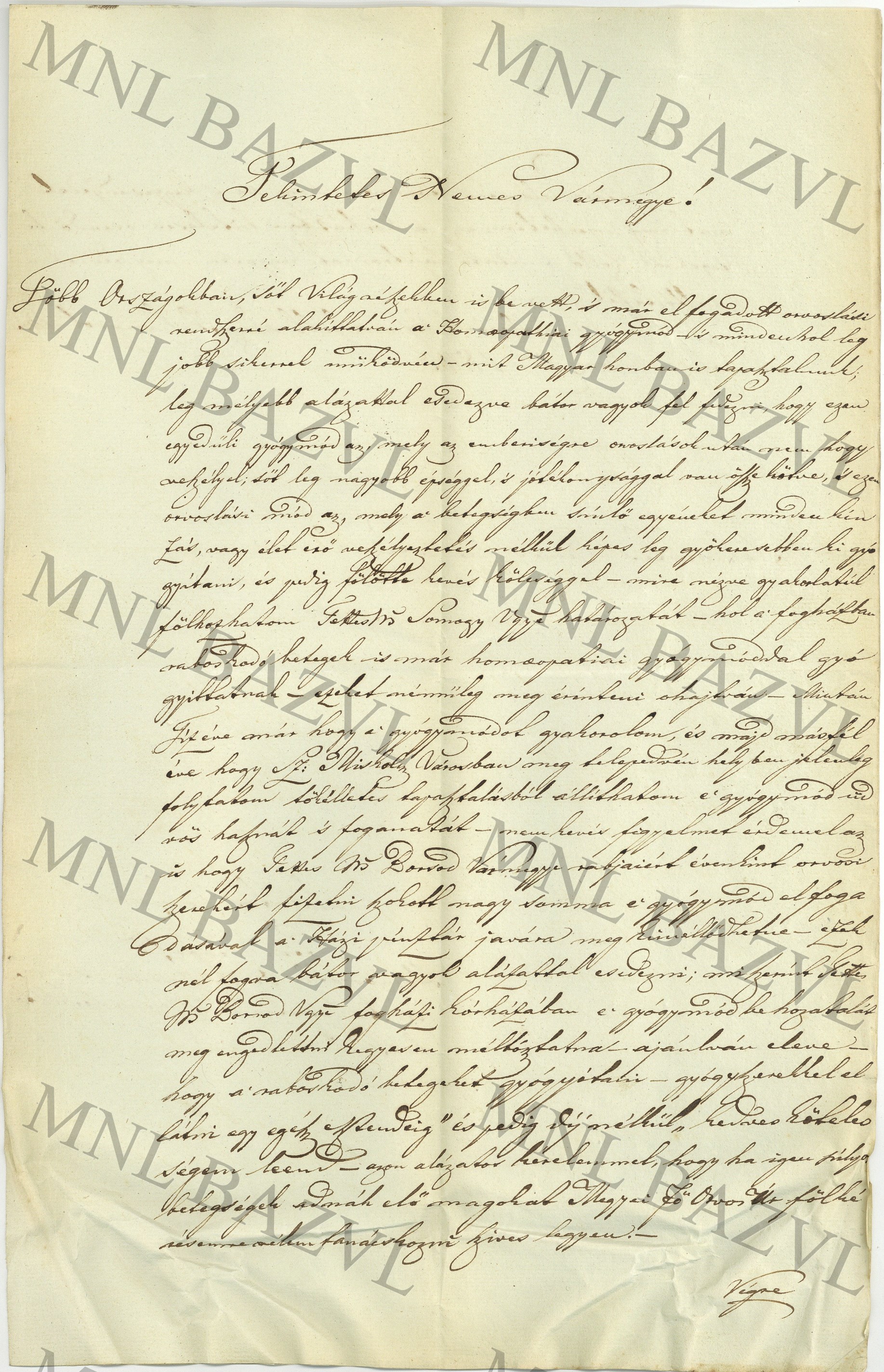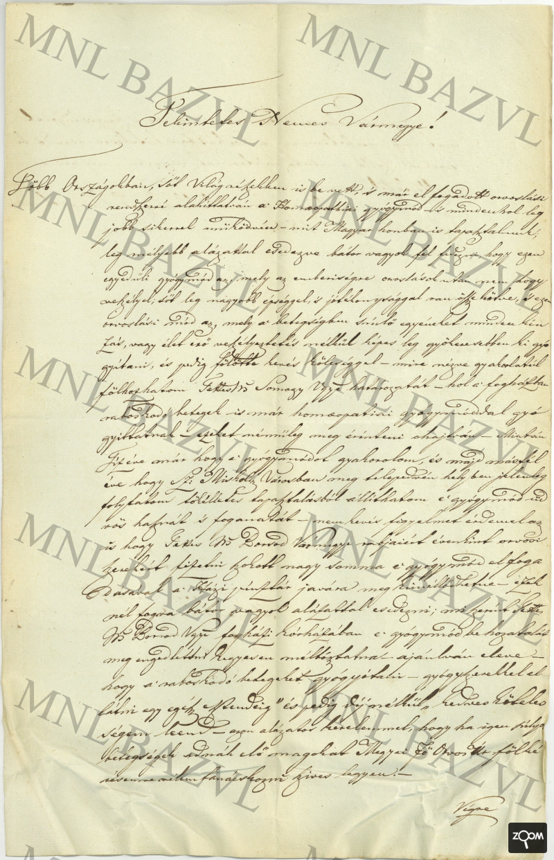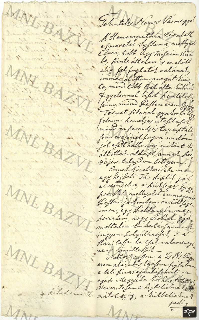 Tekintetes Nemes Vármegye! Szép honunkban, minden jóban, hasznosban s a haza boldogságát eszközlő üdvös lépésekben előrehaladásáról ismert Borsod vármegye tekintetes rendeitől ezen az emberiségre, de főleg a megyei szegény adózókra legüdvösebb s legjótékonyabb gyógymód elfogadásával sem hagyva fel, erősen hiszem hogy továbbá is kegyeskednek megengedni a szenvedőknek ez üdvös segélyt használni és más megyék példájára jövendőre az egész kórházra ezen hasonszenvi gyógymódot elrendelni, mihez képest legmélyebb alázattal bátor vagyok esedezni, hogy aminek gyakorlatában alul írtat, ki minden áldozattal dacolva üldözőimmel is legelsőbb voltam Borsod vármegyében ki e gyógymódot gyakoroltam, s a tekintetes vármegye kegyes engedelme mellett közkórházban is használtam, mindenkire jótékony hatással a felhozódott okok és leginkább gazdálkodási szempontból a tekintetes vármegye kegyes belátásához képest megszabandó bizonyos díj mellett megerősítetni és e szent s üdvösséges gyógyszerreli szolgálatomat biztosítani kegyeskedjen!