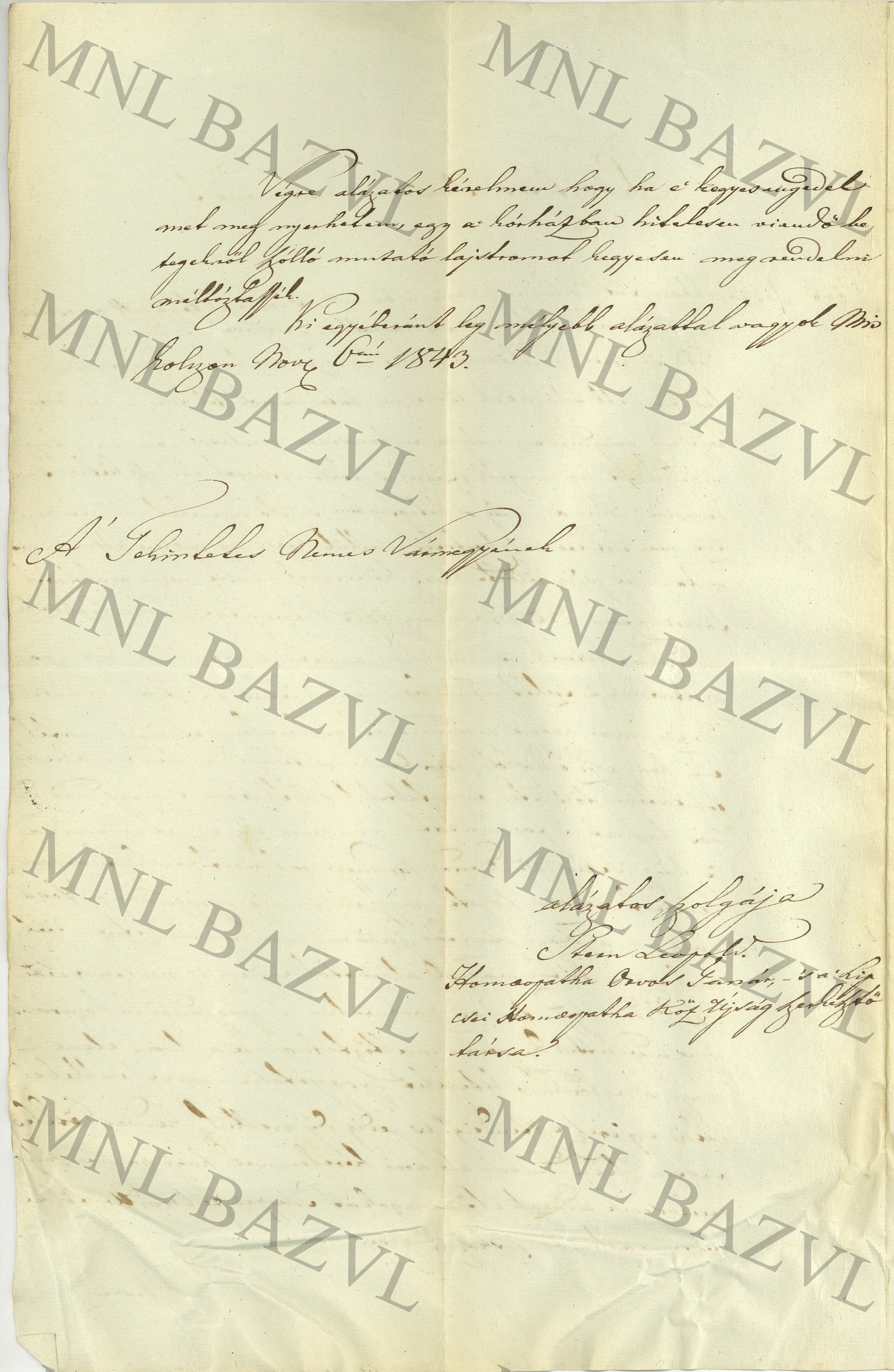 Ki egyébiránt legmélyebb alázattal vagyok Miskolcon november 6-án 1843. A Tekintetes Nemes Vármegyének alázatos szolgálja Stern Leopold homeopatha orvos tanár és a lipcsei homeopatha közújság szerkesztőtársa.”[9]