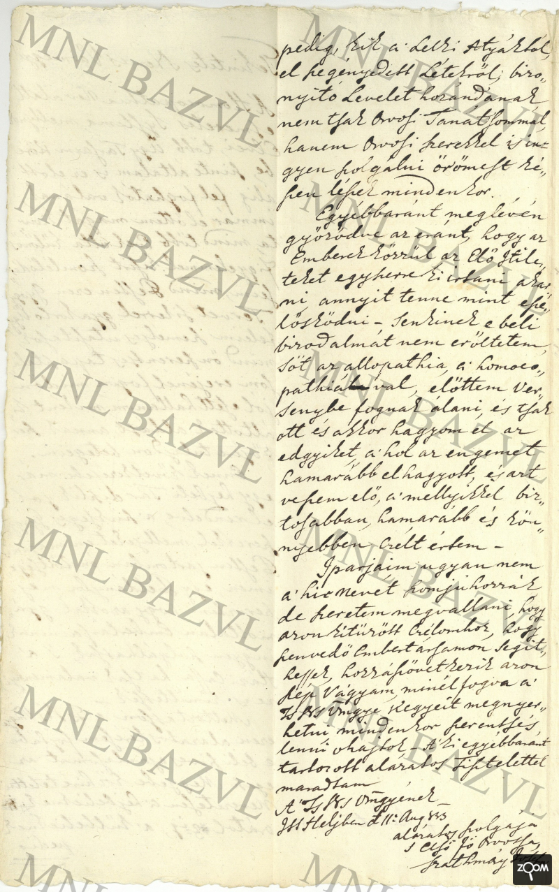 „Tekintetes Nemes Vármegye! Több országokban, sőt világrészekben is bevett s már elfogadott orvoslási rendszerré alakíttatván a homeopátia gyógymód, s mindenhol legjobb sikerrel működvén, mit magyar honban is tapasztalunk. Legmélyebb alázattal esedezve bátor vagyok felfedezni, hogy ezen egyedüli gyógymód az melyik az emberiségre orvoslások után nemhogy veszéllyel, sőt legnagyobb épséggel, s jótékonysággal van összekötve, s ezen orvoslási mód a betegségben sínylődő egyéneket minden kínzás vagy életerő veszélyeztetés nélkül képes leggyökeresebben kigyógyítani és pedig fölötte kevés költséggel, mire nézve gyakorlatul felhozhatom tekintetes Somogy vármegye határozatát, hol a fogházban raboskodó betegek is már homeopátiai gyógymóddal gyógyíttatnak, ezeket minéműleg megérinteni óhajtván. Miután tíz éve már hogy a gyógymódot gyakorlom, és majd másfél éve hogy Miskolc városban megtelepedvén, helyben jelenleg folytatom, tökéletes tapasztalásból állíthatom e gyógymód üdvös hasznát s foganatát. Nem kevés figyelmet érdemel az is, hogy a Tekintetes Nemes Borsod Vármegye rabjaiért évenként orvosi szerekért fizetni szokott nagy summa e gyógymód elfogadásából a házi pénztár javára megkímélődhetne. Ezeknél fogva bátor vagyok alázattal esedezni, mi szerint Tekintetes Nemes Borsod Vármegye fogházi kórházában e gyógymód behozatalát megengedni kegyesen méltóztatna, ajánlván eleve hogy a raboskodó betegeket gyógyítani gyógyszerekkel ellátni egy egész esztendeig és pedig díj nélkül kedves kötelességem leend. Azon alázatos kérelemmel, hogy ha igen súlyos betegségek adnák elő magukat a megyei főorvos úr felkérésemre velem tanácskozni szíves legyen.