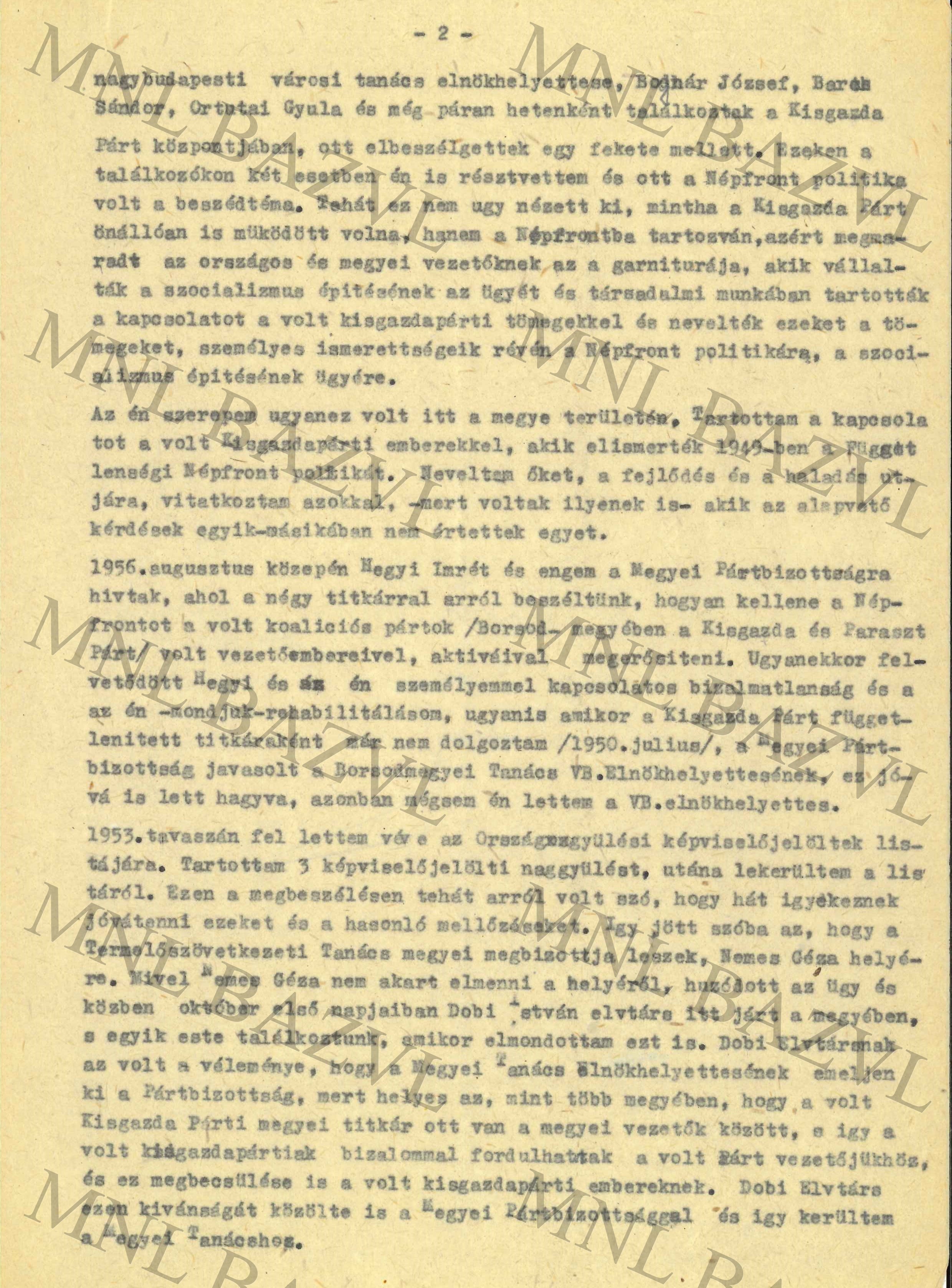 Németh Imre, a Kisgazdapárt Borsod megyei titkára 1957 végén ragadott tollat, hogy pártja elmúlt tíz éves történetének összefoglalásával segítse Grósz Károly későbbi miniszterelnök – akkor a megyei pártbizottság agitációs- és propaganda osztályvezetője – közelebbről nem ismert „munkáját”. A tíz éve titkos kommunistaként szolgáló Németh énközpontú és szűkszavú beszámolója bepillantást enged a már a kommunista párt markában „működő” párt életébe és egyúttal a többpártrendszert mímelő és látszatdemokráciát fenntartó proletárdiktatúra működésébe.