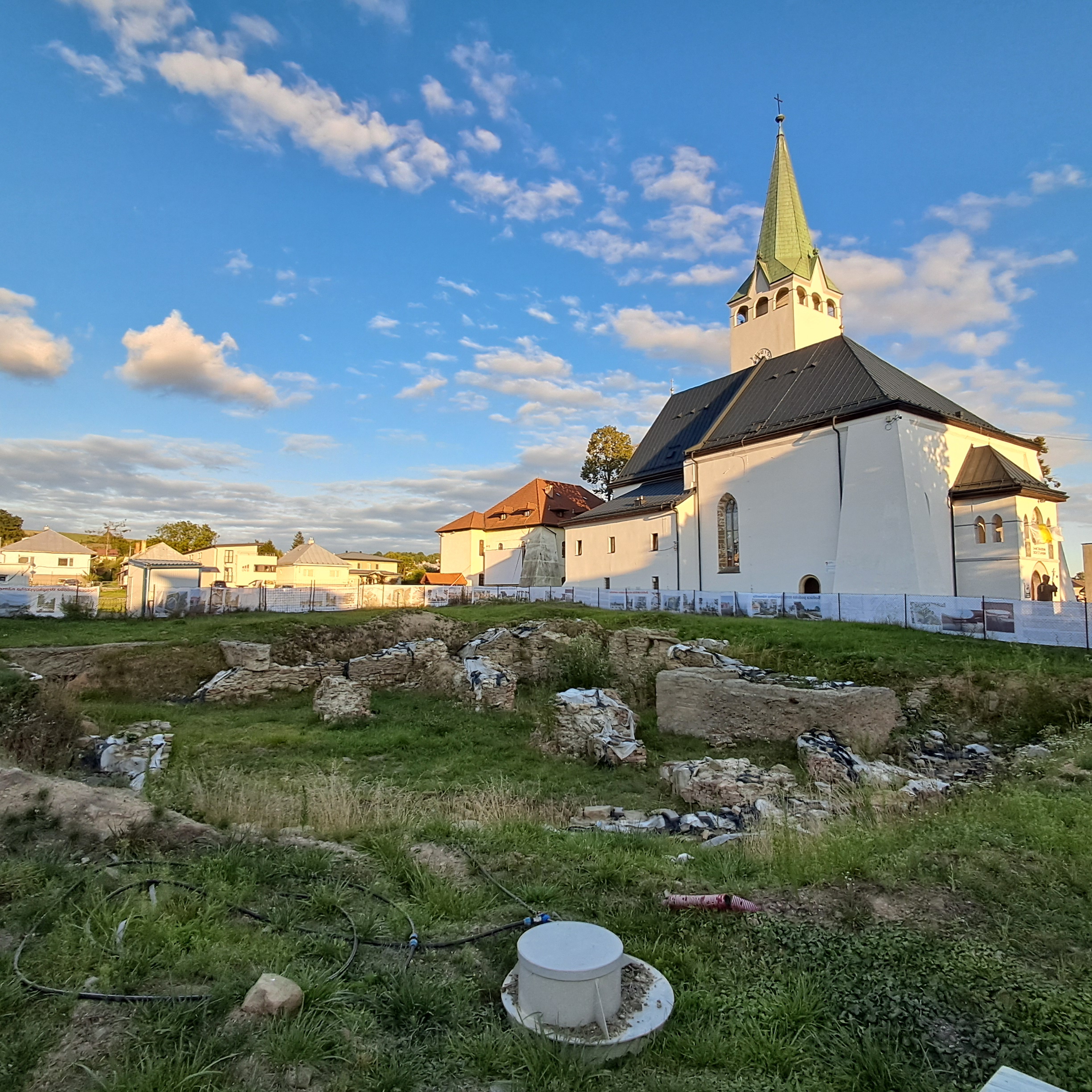A sztropkói vár romjai, háttérben a vártemplom és a megmaradt palotaszárny épülete 2025-ben (A szerző felvétele)