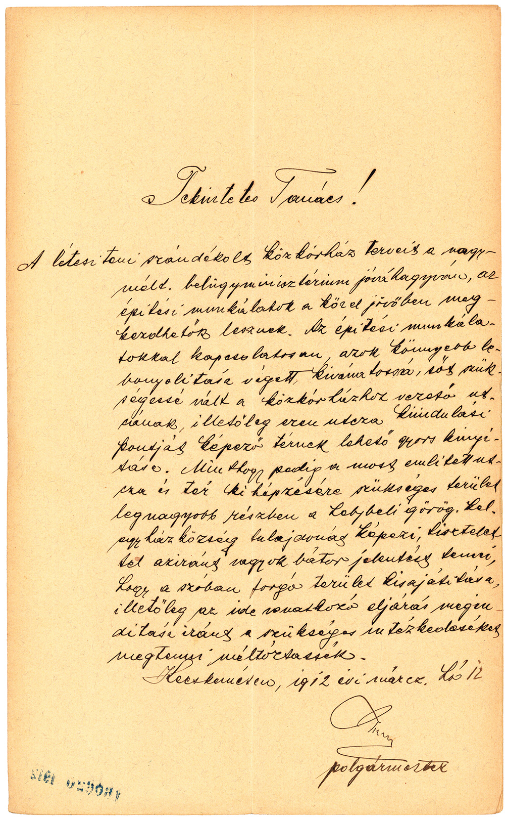 kelt levele a tanácsnak az exhumálások elhalasztása tárgyában