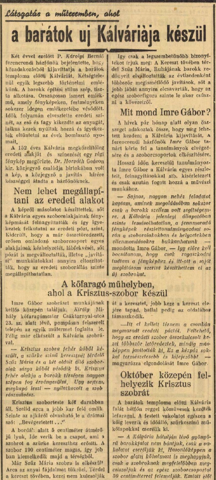 [16] „Látogatás a műteremben, a barátok uj Kálváriája készül”. Kecskeméti Közlöny, 1943. október 2. 7.; HU-MNL-BKML-IV.1910.c. 4778/1944.