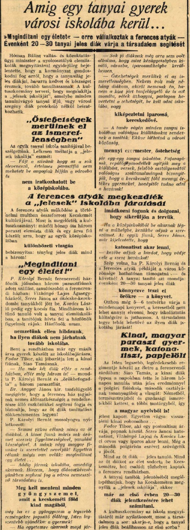 [8] „Amig egy tanyai gyerek városi iskolába kerül…”. Kecskeméti Közlöny, 1941. szeptember 13. 11.
