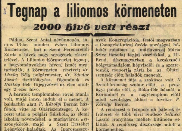 [11] „Tegnap a liliomos körmeneten 2000 hívő vett részt”. Kecskeméti Közlöny, 1941. június 14. 3.