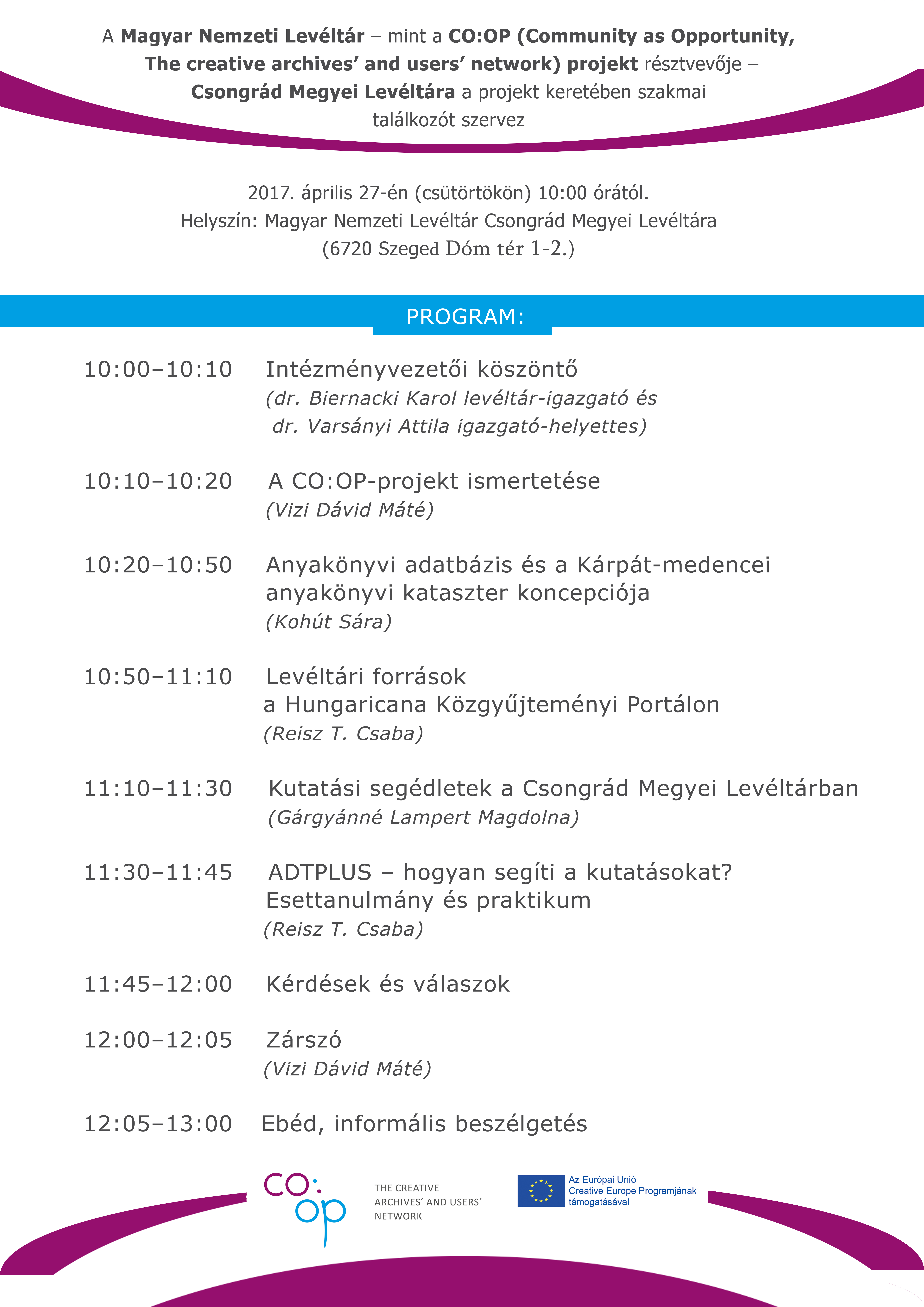 A Magyar Nemzeti Levéltár – mint a CO:OP (Community as Opportunity, The creative archives’ and users’ network) projekt résztvevője – Csongrád Megyei Levéltára a projekt keretében szakmai találkozót szervez 2017. április 27-én (csütörtökön) 10:00 órától.
