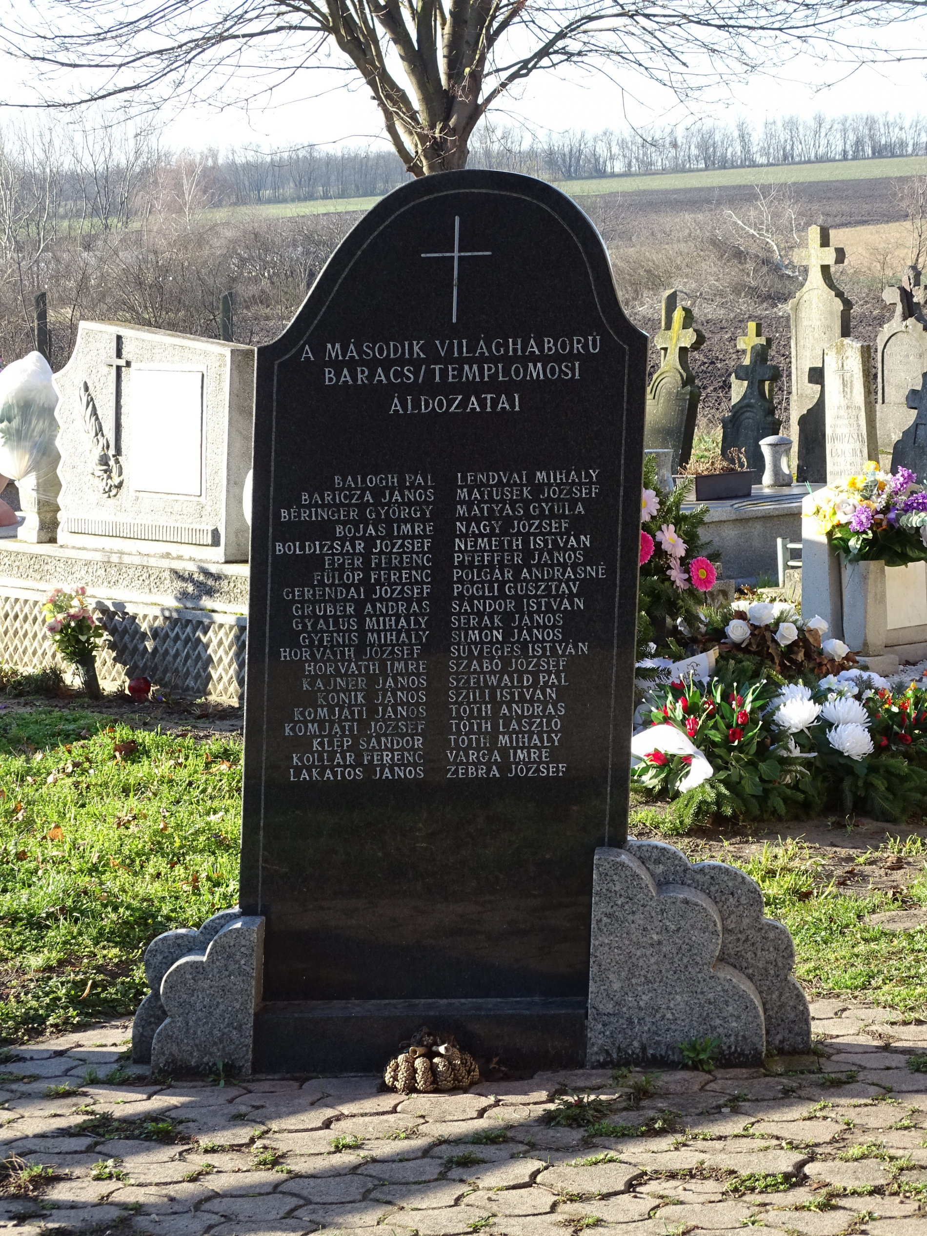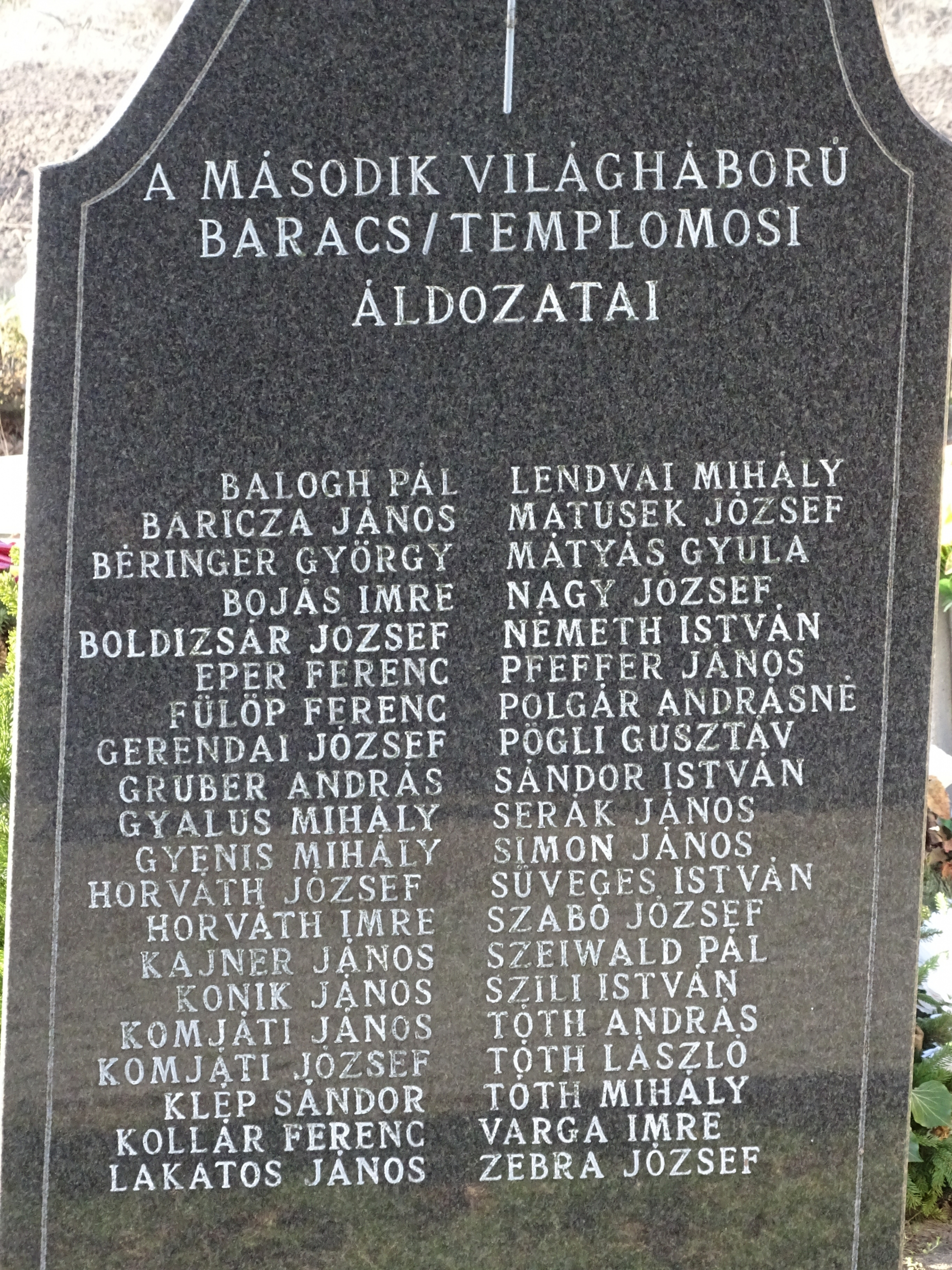 A baracsi képviselő-testület 1994. február 17-én határozatot hozott arról, hogy az apátszállási és templomosi településrészen lévő temetőkbe a második világháborúban elesettek emlékére felállításra kerülő emlékmű megvalósításához pályázatot nyújt be Palotás József szobrászművész tervezetére a Képző- és Iparművészeti Lektorátushoz. A határozat szerint a pályázat elnyerése esetén a szobrászművész terve szerinti emlékművek kerülnek felállításra, a pályázat elutasítása esetén pedig a helyi sírkőkészítő által adott ajánlat szerinti valósul meg.[2]
