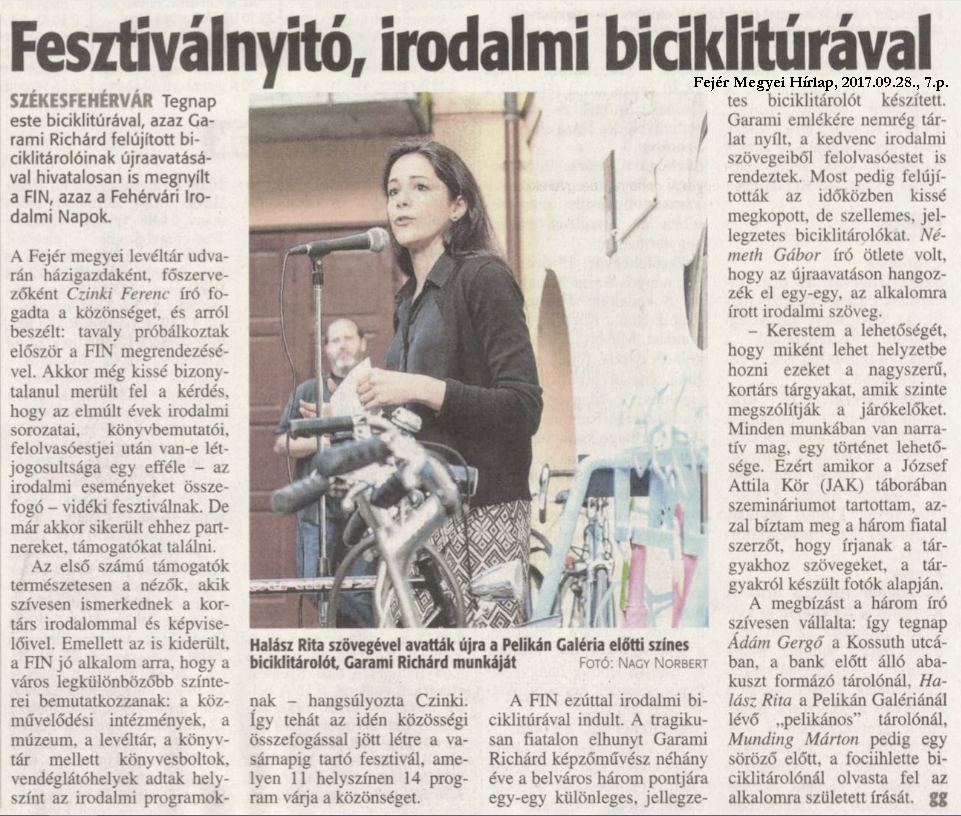 A 2017-es második FIN kiemelt eseménye volt Garami Richárd (Székesfehérvár, 1976 – Budapest, 2016) művészi biciklitárolóinak („Velo Stations”) újraavatása. Három különleges biciklitárolóként funkcionáló szobrot álmodott fémbe a fiatalon elhunyt intermédia művész, amelyek ma is színt visznek Székesfehérvár életébe.