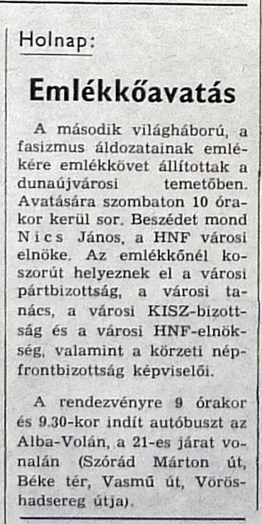 Ám Takács Imre, a megyei pártbizottság vezetője kijelentette: Amíg én itt leszek, Dunaújvárosban nem lesz emlékmű! Mi az, hogy még a neveket is felírni, akik közül sokan fasiszták voltak! Az egész ügyet állítsák le!