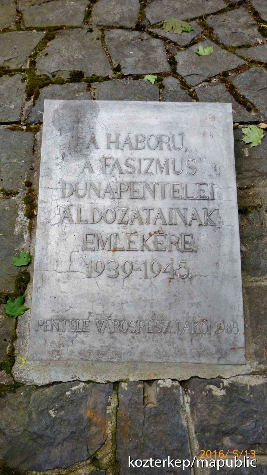S lőn: 1985. februárjában a népfront, valamint a kormány tanácsi hivatala úgy foglalt állást, hogy lehetséges emlékművet állítani a II. világháború áldozatainak. Ettől fogva hiába volt minden huzavona: december 7-én felavatták a három kőoszlopból álló emlékművet, tábláján a hivatalosan jóváhagyott felirattal: A háború, a fasizmus dunapentelei áldozatainak emlékére – 1939-1945 – Pentele városrész lakói – 1985. Ám az áldozatok névsorát a bizottság tagjainak kellett titokban, egy kapszulában az emlékmű talapzatába csempészni…