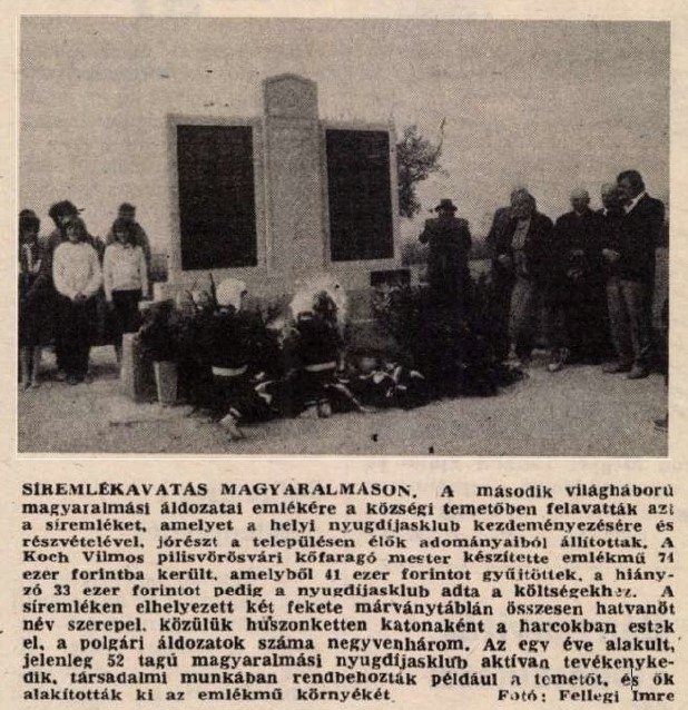 Magyaralmáson 1988. április 30-án került sor a második világháború áldozatai emlékére emelt emlékmű ünnepélyes avatására.[1] A helyi nyugdíjas klub kezdeményezésére, és jórészt a településen élők adományaiból Koch Vilmos pilisvörösvári kőfaragó mester készítette el az emlékművet. Az alkotás költsége 74 000 Ft-ot tett ki, melyből 41 000 Ft adományok gyűjtéséből származott, a hiányzó 33 000 Ft-ot ugyanakkor a nyugdíjas klub ajánlotta fel. A síremléken elhelyezett két fekete márványtáblán összesen hatvanöt név szerepel, közülük huszonketten katonaként a harcokban estek el, a polgári áldozatok száma negyvenhárom fő volt.[2]