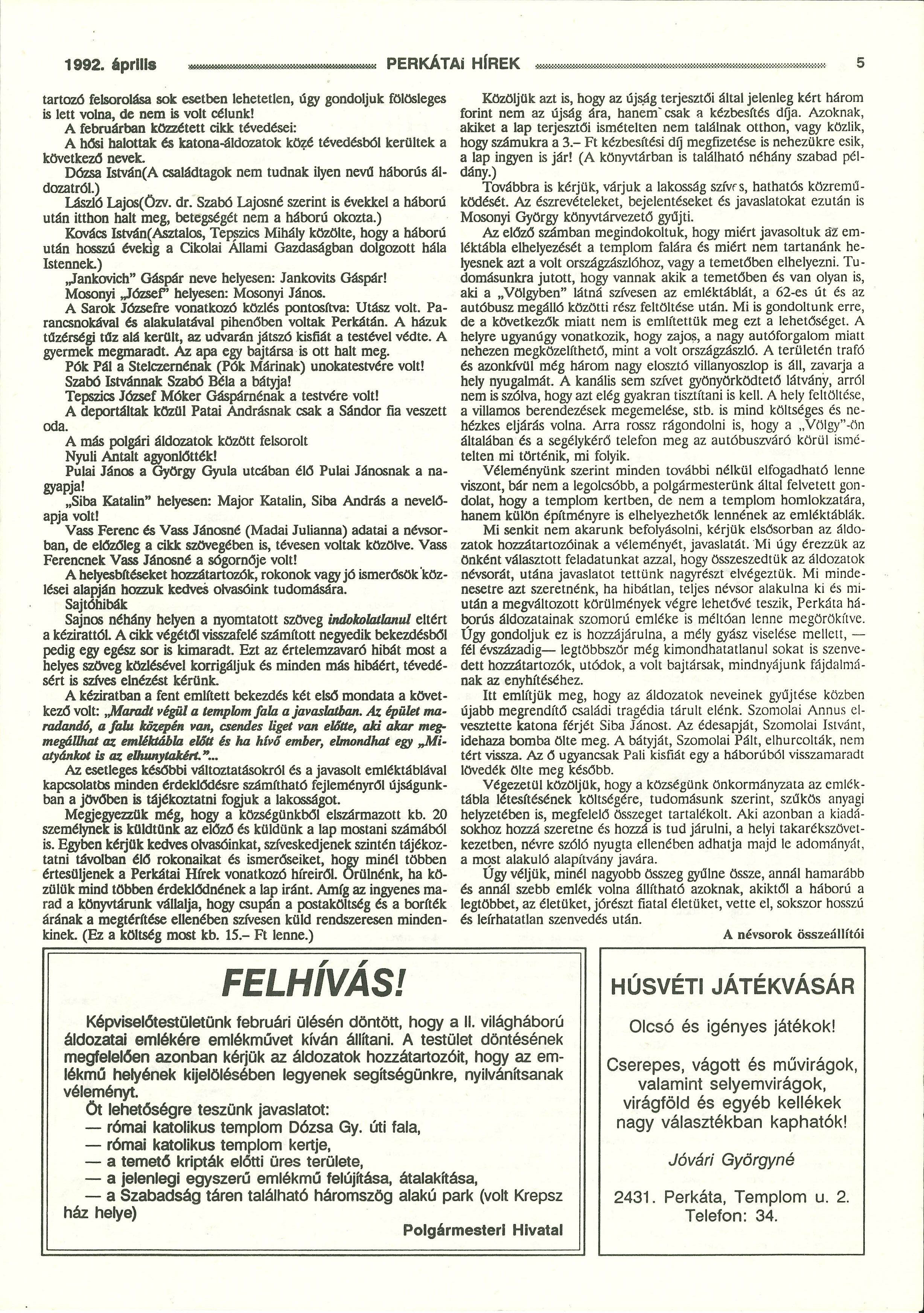 [2] Perkátai Hírek 1992. április. 5. p.