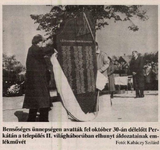 A II. világháború perkátai áldozatai tiszteletére emelt emlékmű avatási ünnepségét 1993. október 30-án tartották. Az emlékművet Dr. Erdős Ferenc, a Fejér Megyei Levéltár igazgatója leplezte le. Az ünnepségen részt vett még az Egyházmegyei Hatóság képviselője és Perkáta testvértelepülése, Saint-Maximin polgármestere, Serge Macudzinski és a francia küldöttség is. Az avatáson a Hunyadi Mátyás Általános Iskola tanulói és a dunaújvárosi Móricz Zsigmond Általános Iskola ének-zene tagozatos diákjai adtak műsort.[10]