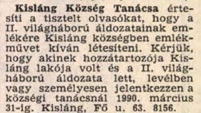 Kislángon lakossági kezdeményezés indult 1989 őszén egy II. világháborús emlékmű felállítására.[1] A községi tanács hirdetményei és a Népszabadságban megjelent felhívás[2] eredményeképpen 1990 márciusára 40.000 Ft gyűlt össze a lakosság részéről.[3]