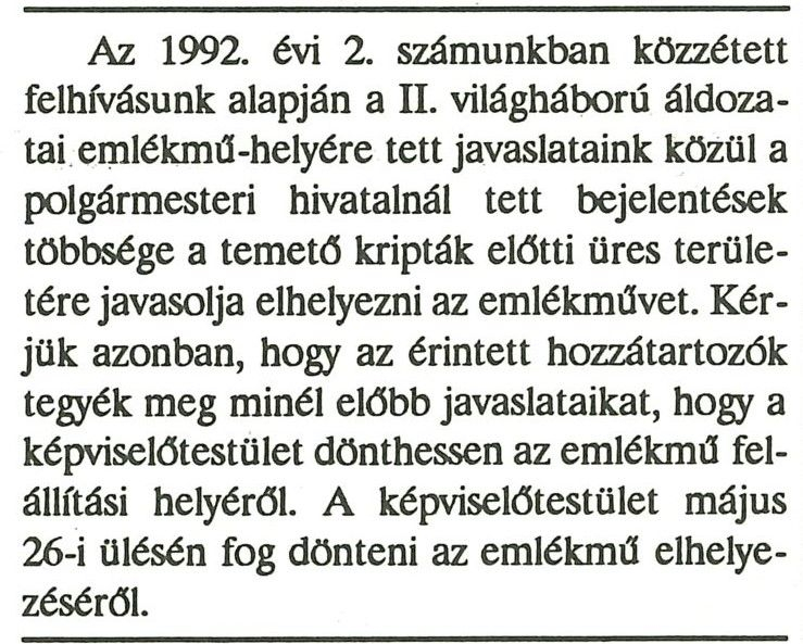 A képviselő-testület az 1992. februári ülésén úgy döntött, hogy a II. világháború áldozatai emlékére emlékművet kíván állítani, ehhez azonban kérték az áldozatok hozzátartozóit, hogy az emlékmű helyének kijelölésében legyenek segítségükre, nyilvánítsanak véleményt. Öt lehetőségre tettek javaslatot: