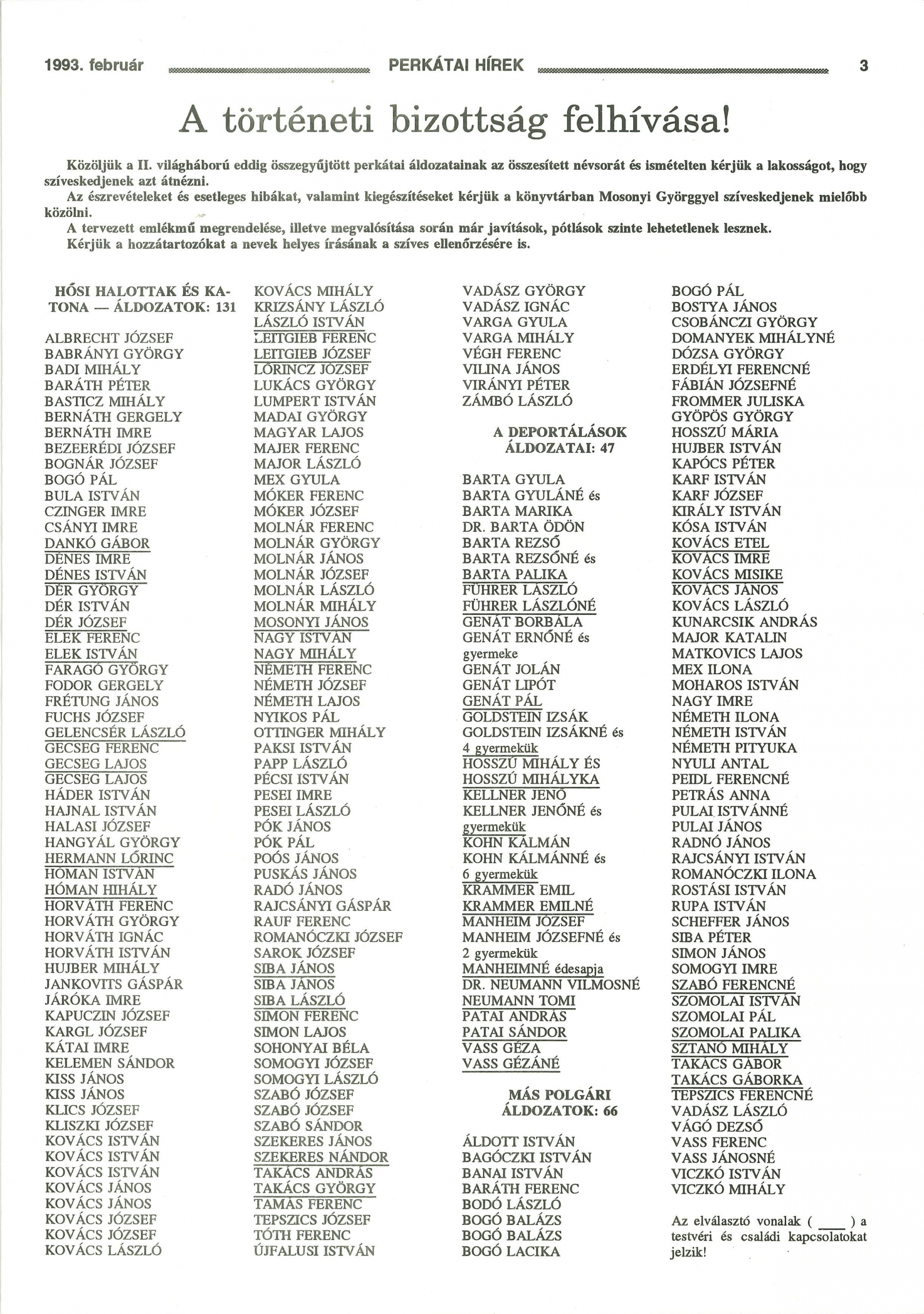 Perkátán 1991 nyarára az évek alatt végzett gyűjtőmunka alapján már kialakult a második világháború áldozatairól egy névsor, amelyet azért állított össze a történeti bizottság, hogyha lesz rá mód, az emlékük megfelelően megörökíthető legyen. A bizottság a névsort további intézkedés és megőrzés végett a nagyközségi képviselő-testület rendelkezésére bocsátotta, ugyanakkor javaslatot is tett egy emléktábla létesítésére. Kérték továbbá, hogy a névsor álljon a község lakosságának rendelkezésére azért, hogy főleg az áldozatok hozzátartozói, de mások is minél többen megtehessék észrevételeiket, ellenőrizhessék a nevek helyesírását, és a névsor kiegészíthető legyen. Mosonyi György könyvtáros javaslatára a Perkátai Hírekben is közzétették a névsort.[1]