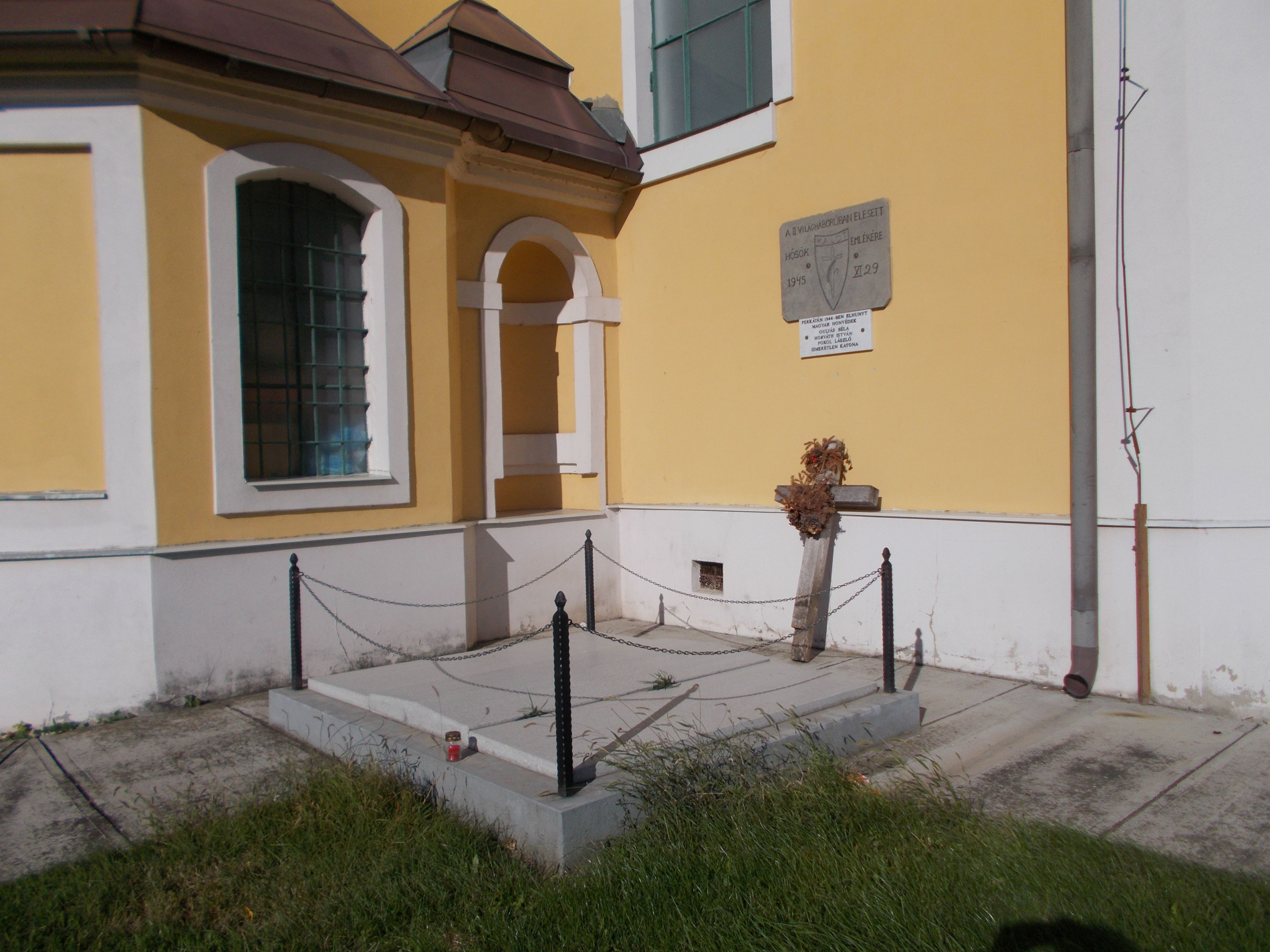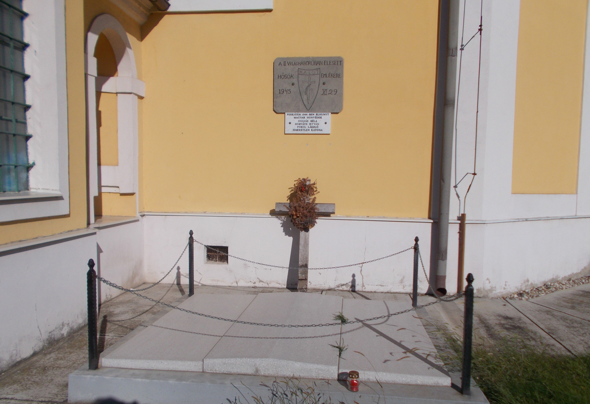 „A katolikus templom szentélye mellett 1944. december 12-én négy magyar katonát temettek el, akik holttestét KALOT legények találták meg és hozták be a faluba, a szőlőhegy térségéből.