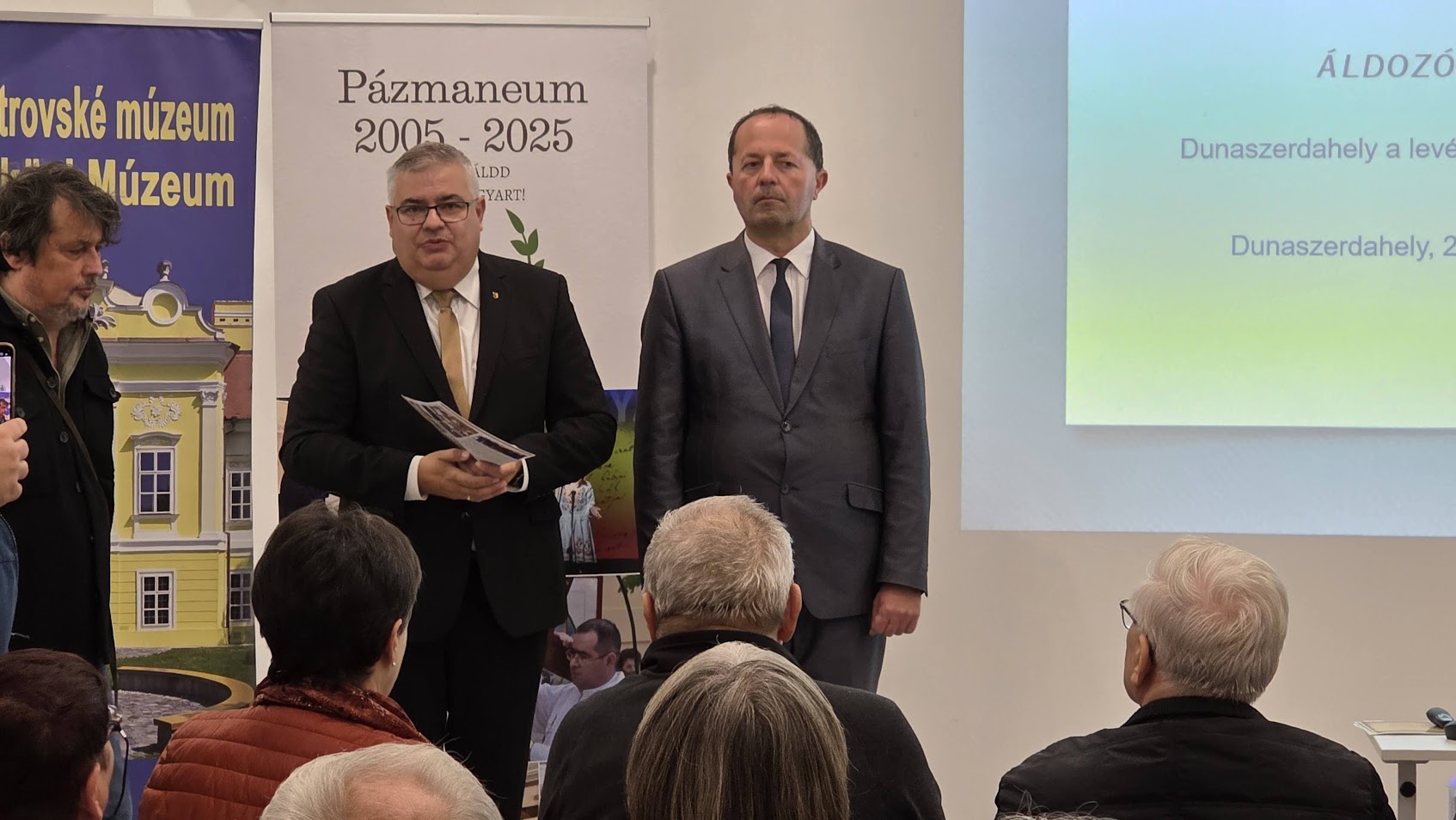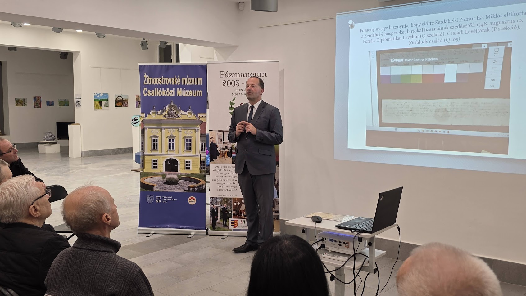 Munktársunk, Áldozó István 2025. november 5-én a Pázmaneum Polgári Társulás szervezésében Dunaszerdahely történetének levéltári forrásaival ismertette meg a hallgatóságot. A rendezvény elején Karaffa Attila alpolgármester köszöntötte az érdeklődőket. Intézményünk osztályvezető főlevéltárosa először a csallóközi várost említő oklevelek digitalizált változatát mutatta be a hallgatóságnak, majd az https://adatbazisokonline.mnl.gov.hu/ oldalon online kutatható 1715. és 1720. évi országos népességösszeírás, Dunaszerdahelyre vonatkozású oldalait láthatták a város polgárai. A népes hallgatóság figyelmét leginkább a szintén online használható első világháborús veszteséglista, valamint a Gulágra elhurcolt csallóközi magyar embereket bemutató adatbázis kötötte le. A program zárásaként Darnai Zsolt, a dunaszerdahelyi Csallóközi Múzeum történésze méltatta intézménye és a Magyar Nemzeti Levéltár Győr-Moson-Sopron Vármegye Győri Levéltára között létrejött együttműködést.