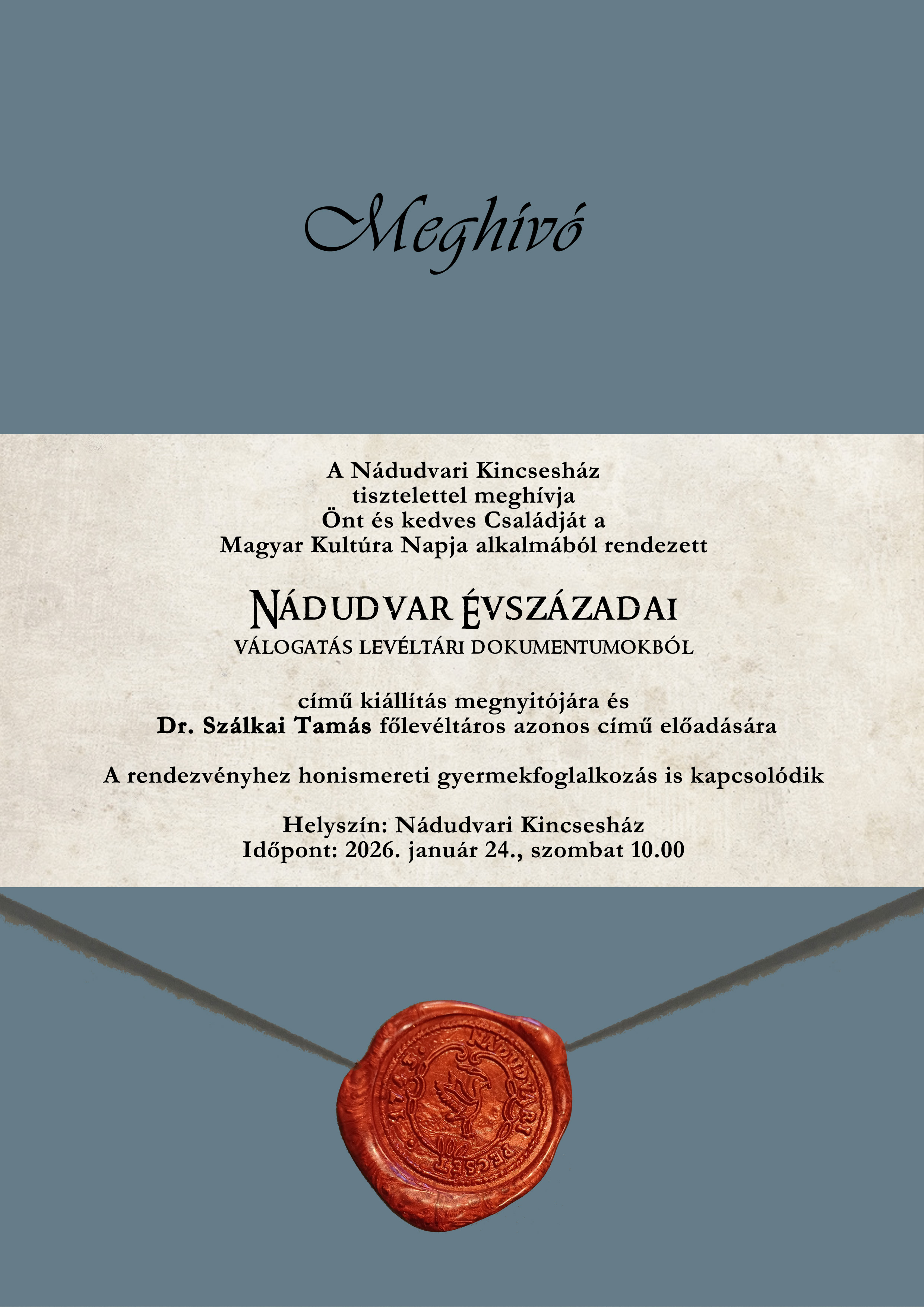 Az MNL Hajdú-Bihar Vármegyei Levéltára és a Nádudvari Kincsesház tisztelettel meghív minden érdeklődőt a Magyar Kultúra Napja alkalmából 2026. január 24-én 10 órakor megrendezésre kerülő „Nádudvar évszázadai – Válogatás a levéltári dokumentumokból" című kiállításra és előadásra.