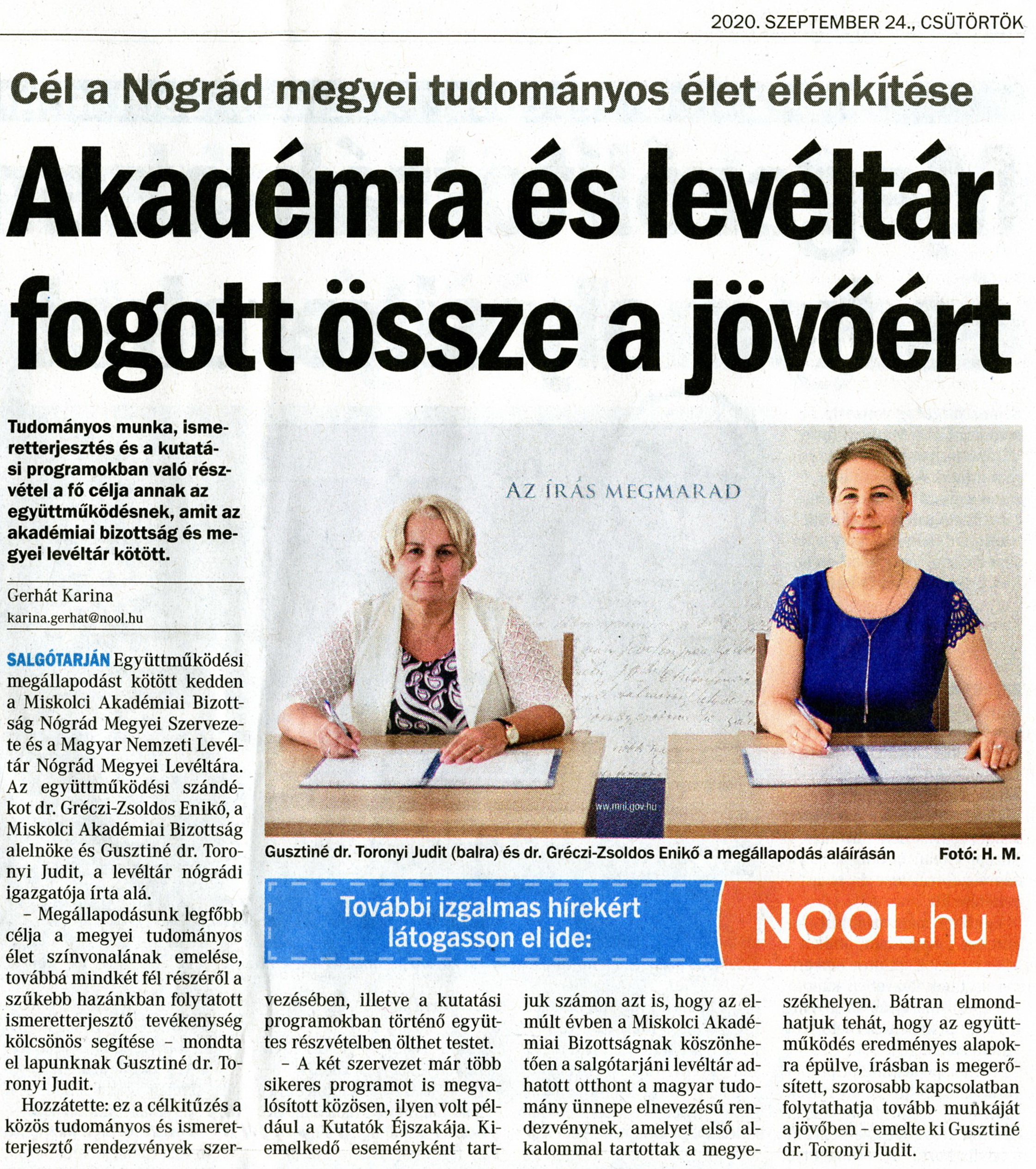 Az írásba fektetett együttműködési szándékot dr. Gréczi-Zsoldos Enikő, a Miskolci Akadémia Bizottság alelnöke, illetve Gusztiné dr. Toronyi Judit, a Magyar Nemzeti Levéltár Nógrád Megyei Levéltárának igazgatója ünnepélyes keretek között írta alá.
