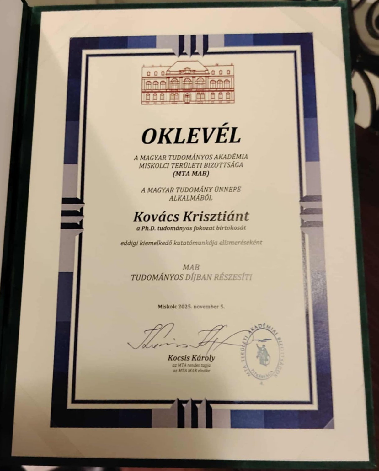 A Magyar Tudományos Akadémia Miskolci Területi Bizottsága a Magyar Tudomány Ünnepe alkalmából kollégánkat, Dr. Kovács Krisztiánt eddigi kiemelkedő kutatómunkája elismeréseként MAB Tudományos Díjban részesítette. A díjátadóra 2025. november 5-én került sor, Miskolcon. Az elismeréshez ezúton is szeretettel gratulálunk!