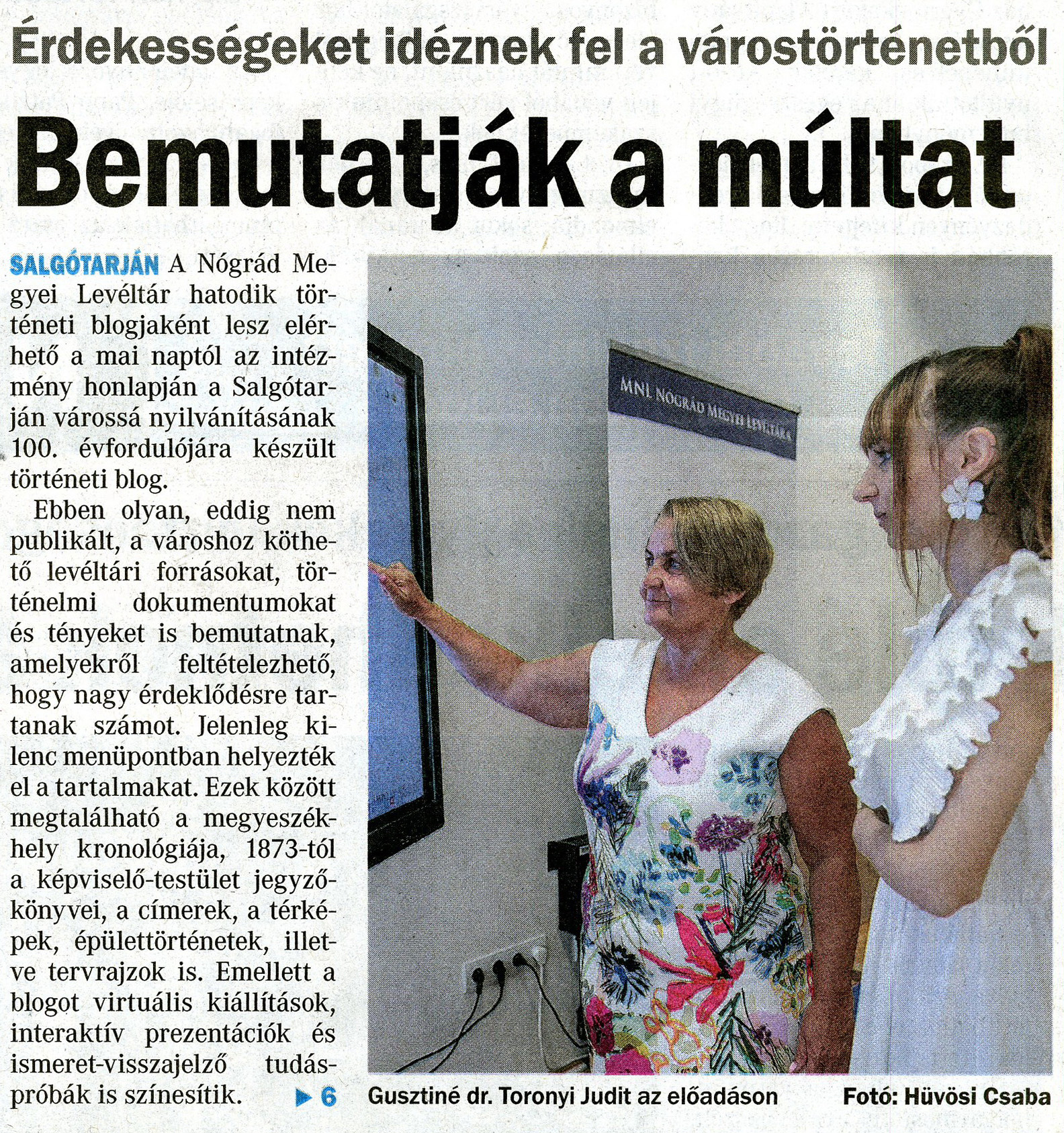 Levéltárunk új blogjának indulására meghirdetett sajtótájékoztatónkat nagy örömünkre a média élénk érdeklődése kísérte, a részletes beszámolónkat az alábbiakban olvashatják. A 2022. július 4-én, hétfőn megtartott sajtótájékoztatón Gusztiné Dr. Toronyi Judit igazgató asszony elmondta, hogy levéltárunk 6. történeti blogjaként mindenki számára elérhető Salgótarján várossá nyilvánításának 100. évfordulójára készült történeti blog. Jelenleg 9 menüpontban találnak tartalmakat. Salgótarján kronológiája, képviselő-testületi jegyzőkönyvek 1873-tól, címerek, térképek, épülettörténetek, tervrajzok, virtuális kiállítások, interaktív prezentációk, és az ismereteket visszajelző tudáspróbával zárul a blog.