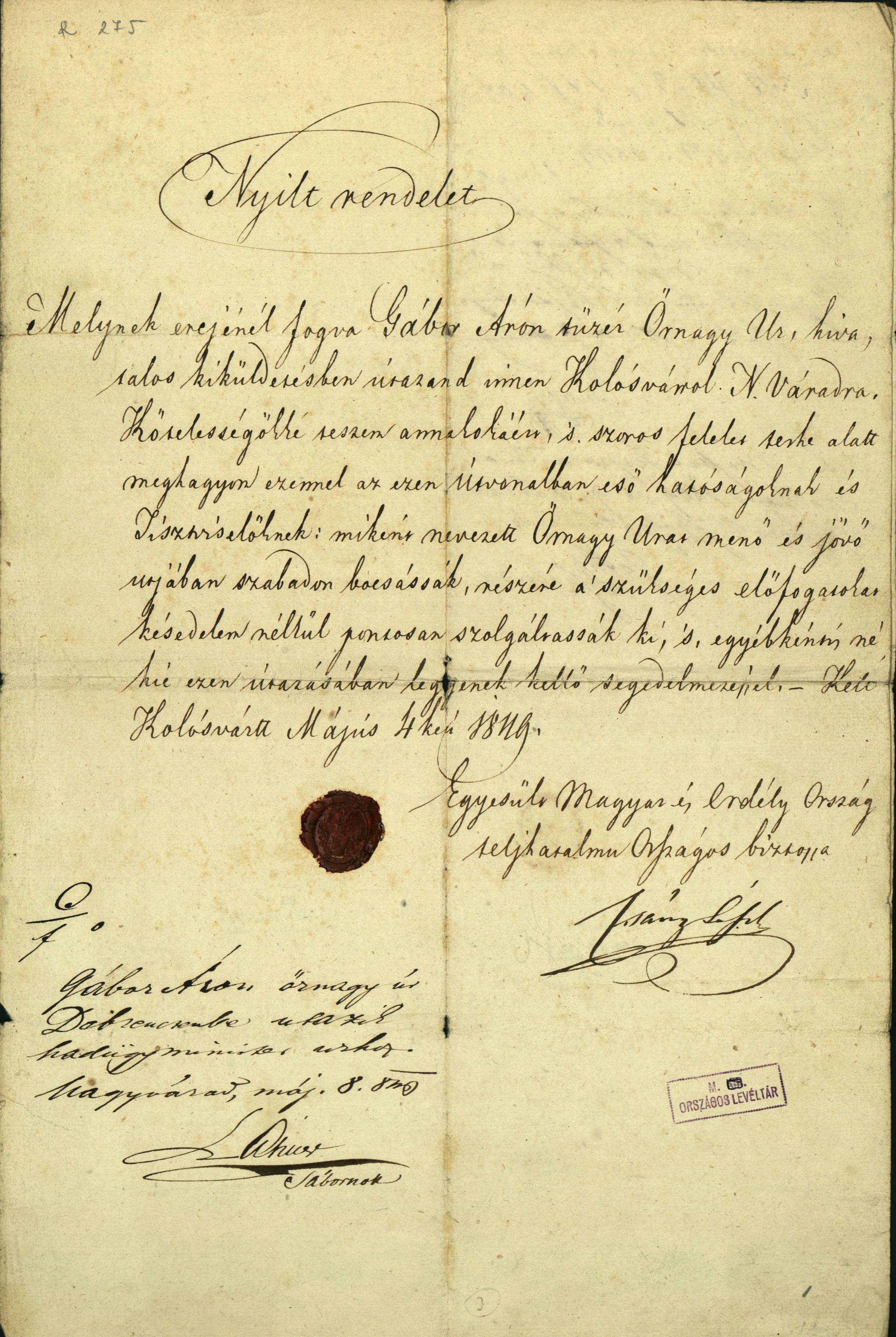 R 275 – 1526 utáni gyűjtemény – 1848/49-es és emigrációs iratok gyűjteménye – Személyek szerinti iratok – Gábor Áronra vonatkozó gyűjtemény