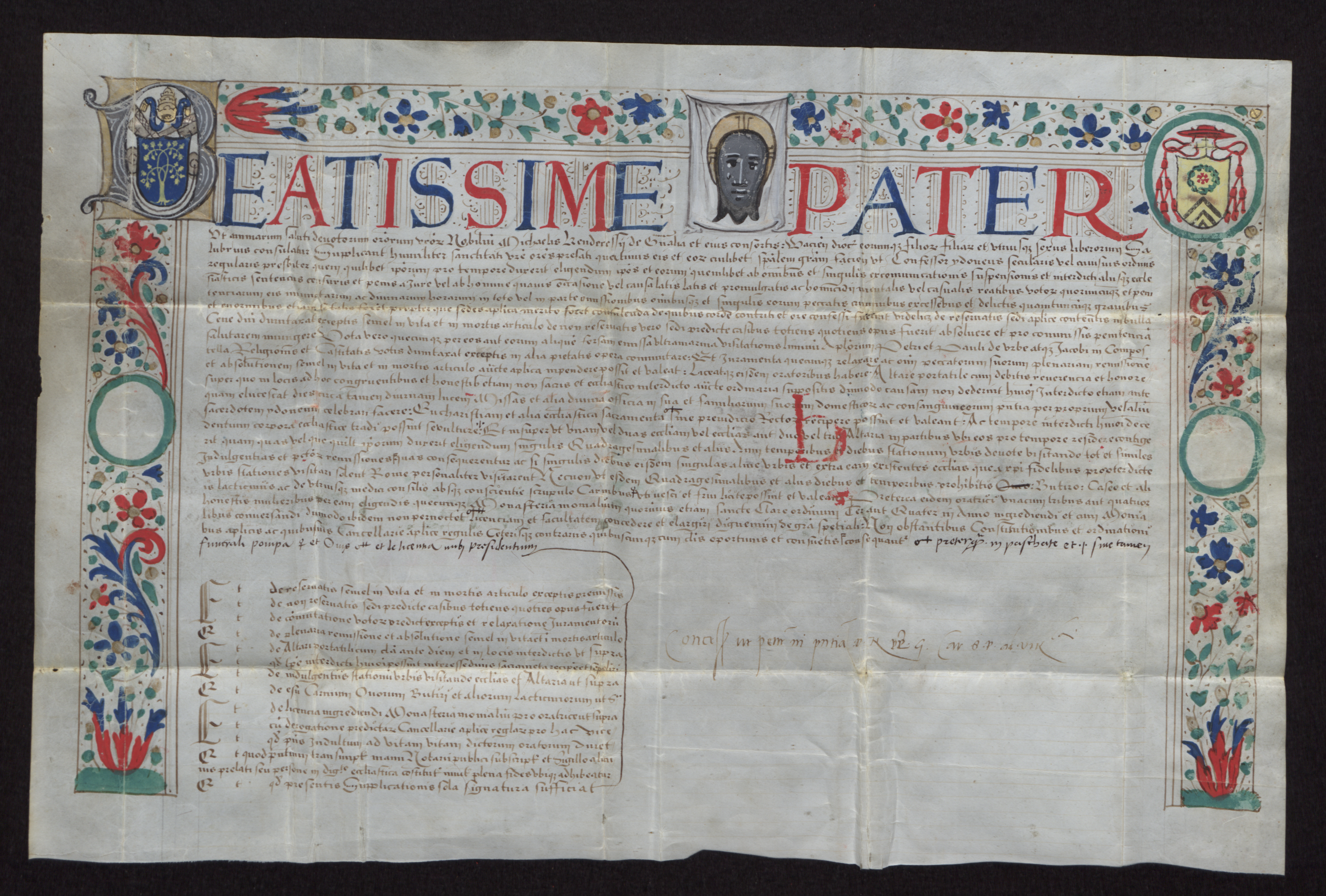 Gyáli Kenderesi Mihály szupplikációja sola signatura lett beadva, tehát olyan, nem eldobandó formában készült, hogy az a költséges pápai kiadványt helyettesítse, és elegendő legyen rá a pápa vagy a bíboros prefektus szignálása az érvényességhez. Kérésének tárgya szabad gyóntató választás volt a maga, felesége és gyermekei részére, vagyis annak a lehetősége, hogy plébánosuk helyett más világi vagy szerzetes paptól kérhessék súlyosabb bűneik, például emberölés alól a feloldozást. A kérvényt – a szokásos papír helyett – pergamenre, egész pontosan úgynevezett déli hártyára írták. A felső szélen és két oldalt virágdíszes szalag keretezi a szöveget. A szentatya megszólításának – a kék és piros betűkkel írt BEATISSIME PATER-nek – B betűje a bal felső sarokban a pápa címerével ékes, és elárulja a pápa kilétét, a della Rovere családból származó II. Gyulát. Jobb oldalon a szignálást végző bíboros, G [aleotto Franciotti della Rovere] címere kapott helyet. Sajátkezű feljegyzése az oklevél szövege alatt, a záradékoktól jobbra olvasható. Az ő hivatali ideje datálja az oklevelet 1503 és 1507 közé. A két oldalon futó szalagok közepén is találunk címerek befestésére alkalmas helyet, ezeket azonban nem töltötték be.