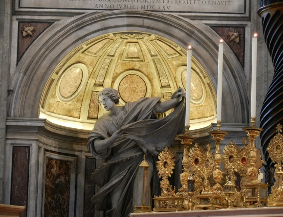 A felül húzódó virágdíszes szalag közepén láthatjuk Veronika kendőjének az ábrázolását. A bűneiért bocsánatot esdeklő ember reménye az érte szenvedést vállaló Megváltó, az Ő arcára tekint, miközben földi helytartójához folyamodik. A becses ereklye a pápák birtokában volt a 17. század elejéig. Az új Szent Péter bazilika kupolájának egyik tartó pillérében kialakított kincstárban őrizték annak 1608-as kifosztásáig.