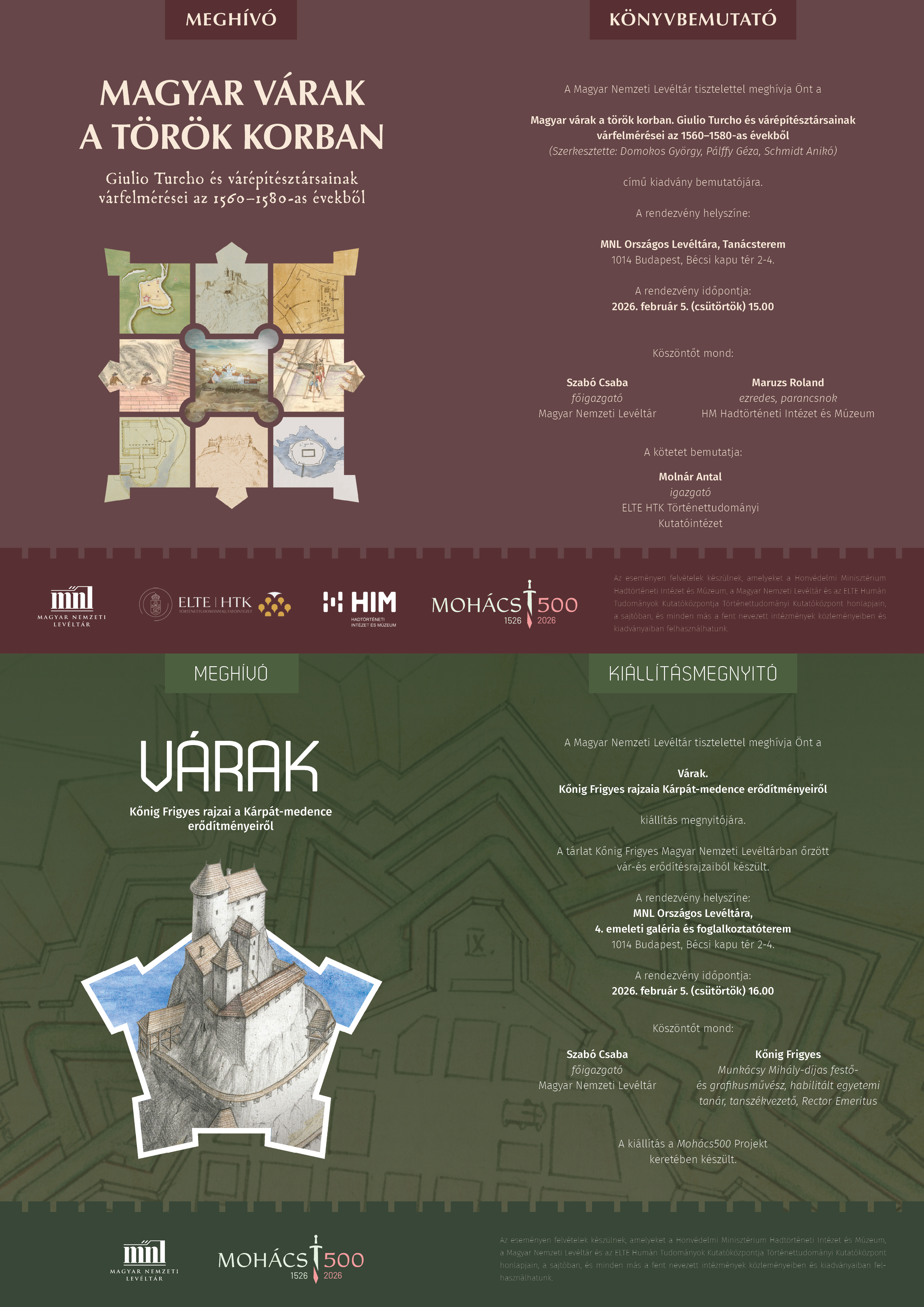 A kötetbemutató után nyílik meg a „Várak. Kőnig Frigyes rajzai a Kárpát-medence erődítményeiről” című kiállítás. A tárlat Kőnig Frigyes Munkácsy Mihály-díjas magyar festő- és grafikusművész, a Képzőművészeti Egyetem nyugalmazott rektorának Magyar Nemzeti Levéltárban őrzött és részben magántulajdonban levő vár- és erődítésrajzaiból készült, és a Bécsi kapu téri épület IV. emeletén, a galéria- és foglalkoztatóteremben lehet majd megtekinteni. A rendezvényen köszöntőt mond Szabó Csaba, a kiállítást pedig Kőnig Frigyes mutatja be. A kiállítás a Mohács 500 programban készült. A kamarakiállítás egyúttal bevezeti a Magyar Nemzeti Levéltár a mohácsi csata 500 évfordulójának tudományos-ismeretterjesztő programsorozatát.