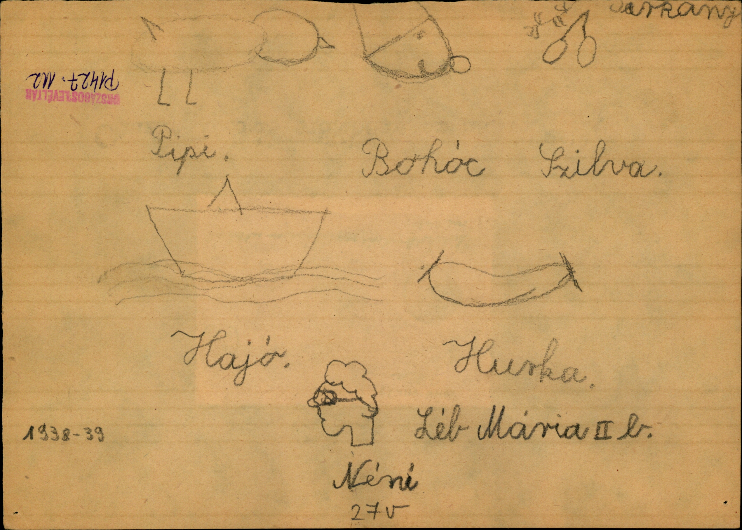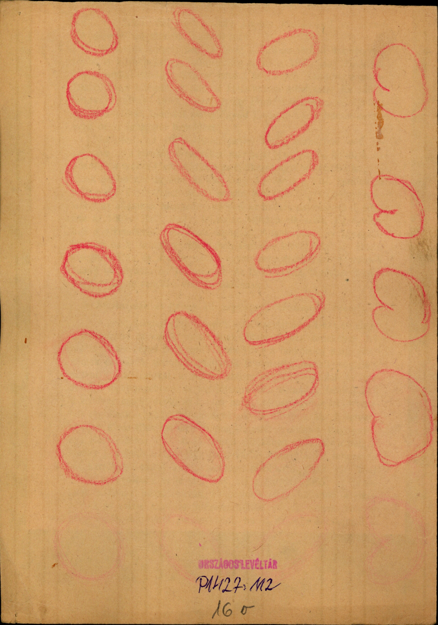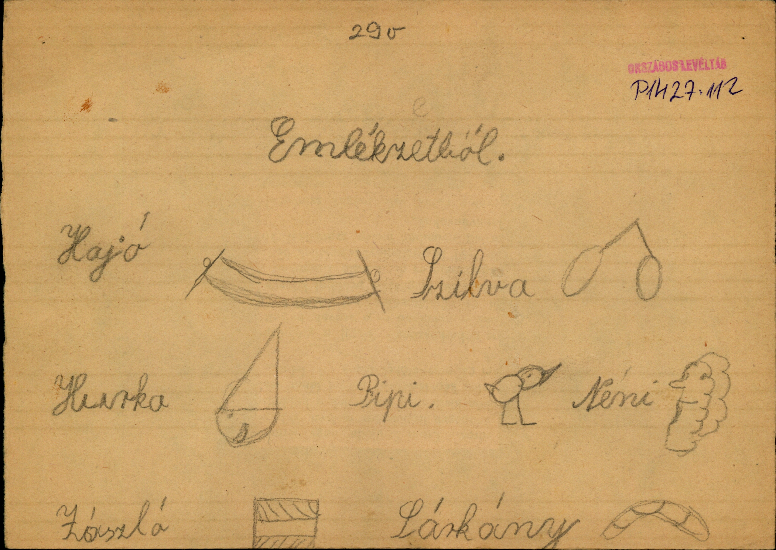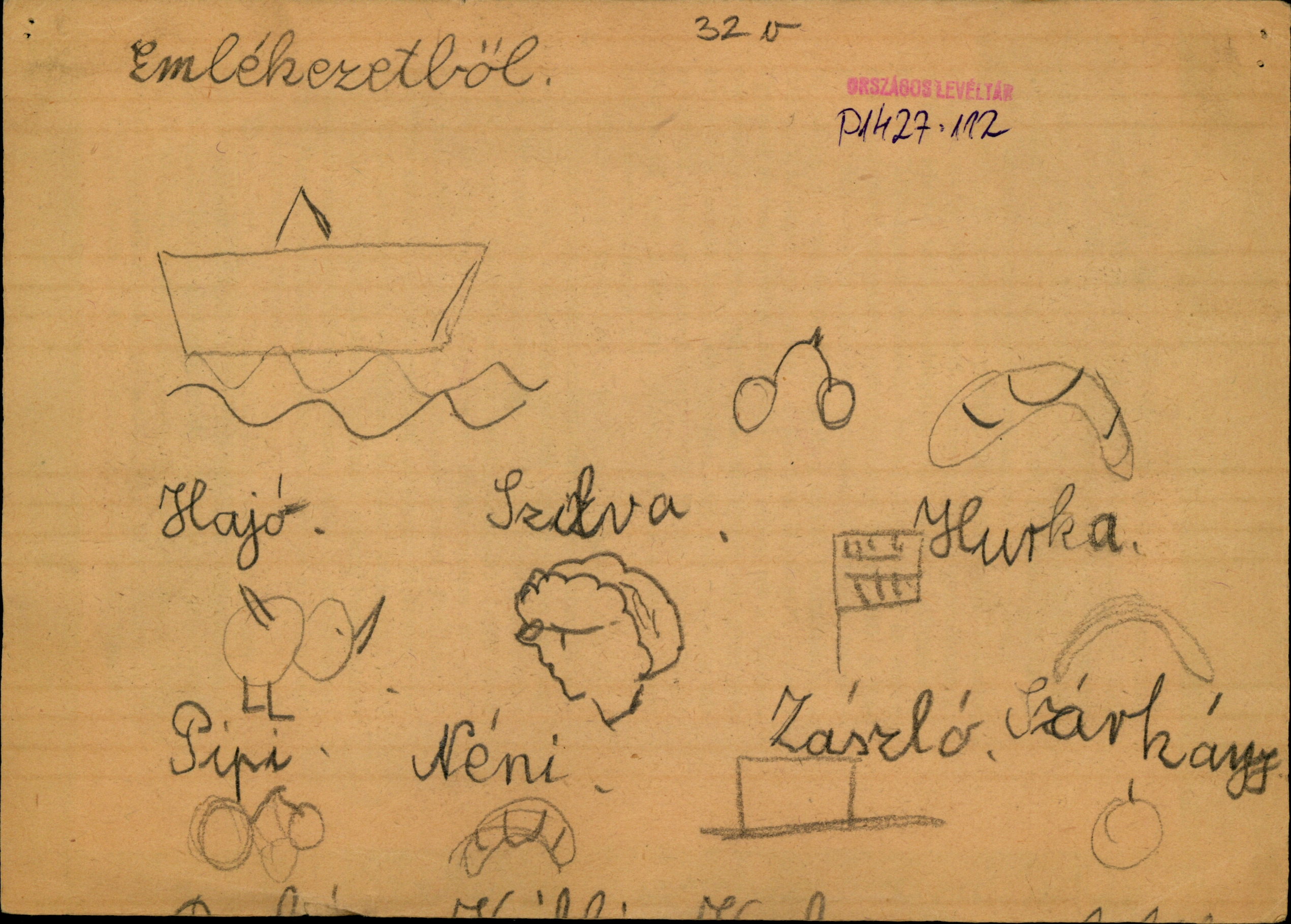 Ami azonban az igazán érdekes, izgalmas és kedves egyszerre, az a képek hátoldala. Gyermekrajzokat láthatunk rajtuk és egyszerű szavakat. A feladat neve: „Emlékezetből”. Ez talán valamiféle „tollbamondás” lehetett, vagyis a jeleléssel előadott szavakat kellett leírniuk és lerajzolniuk a nebulóknak. A hasonló mozdulatokkal bemutatott szavaknál – úgy tűnik – voltak tévedések, például a hurka és szilva esetében. A hurka és a kifli ábrázolása sem egyértelmű minden esetben, és van olyan is, hogy valakinek a fejében egészen más kép él az adott kézjelről.