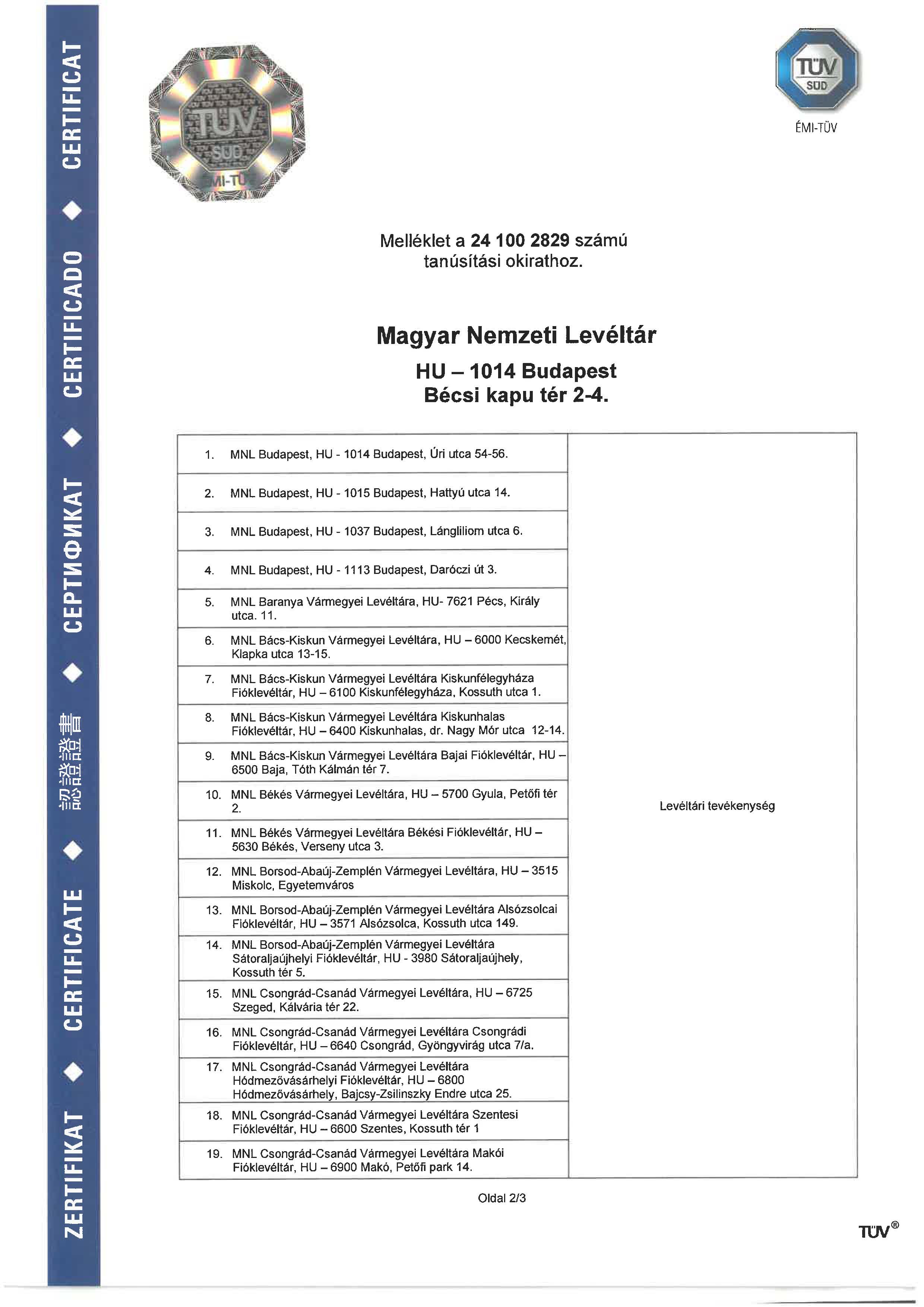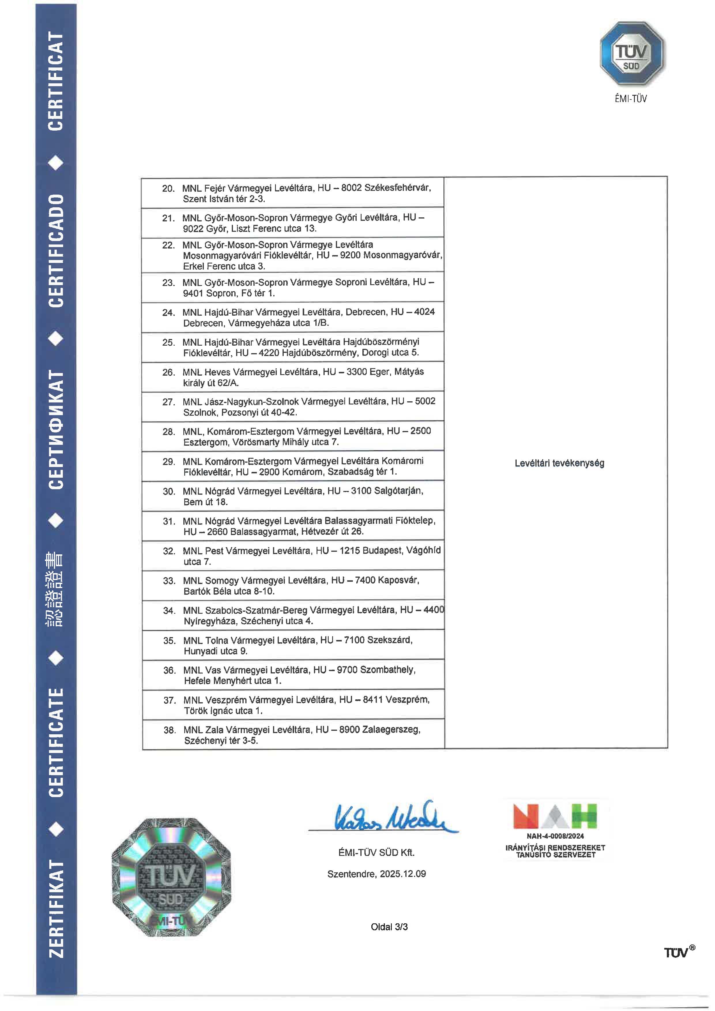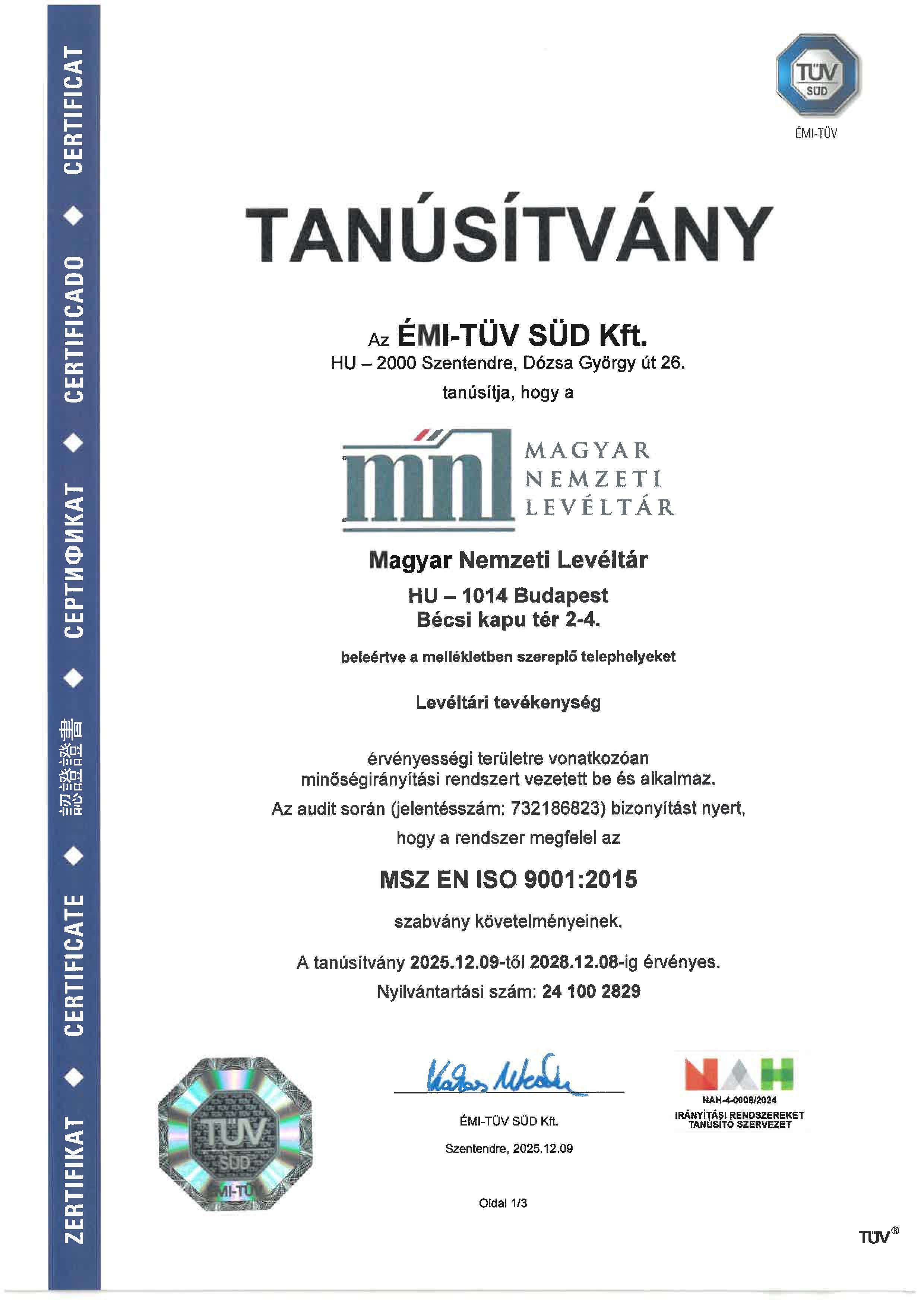 A Magyar Nemzeti Levéltár az MSZ EN ISO 9001:2015 szabvány követelményeinek megfelelő minőségirányítási rendszert működtet.