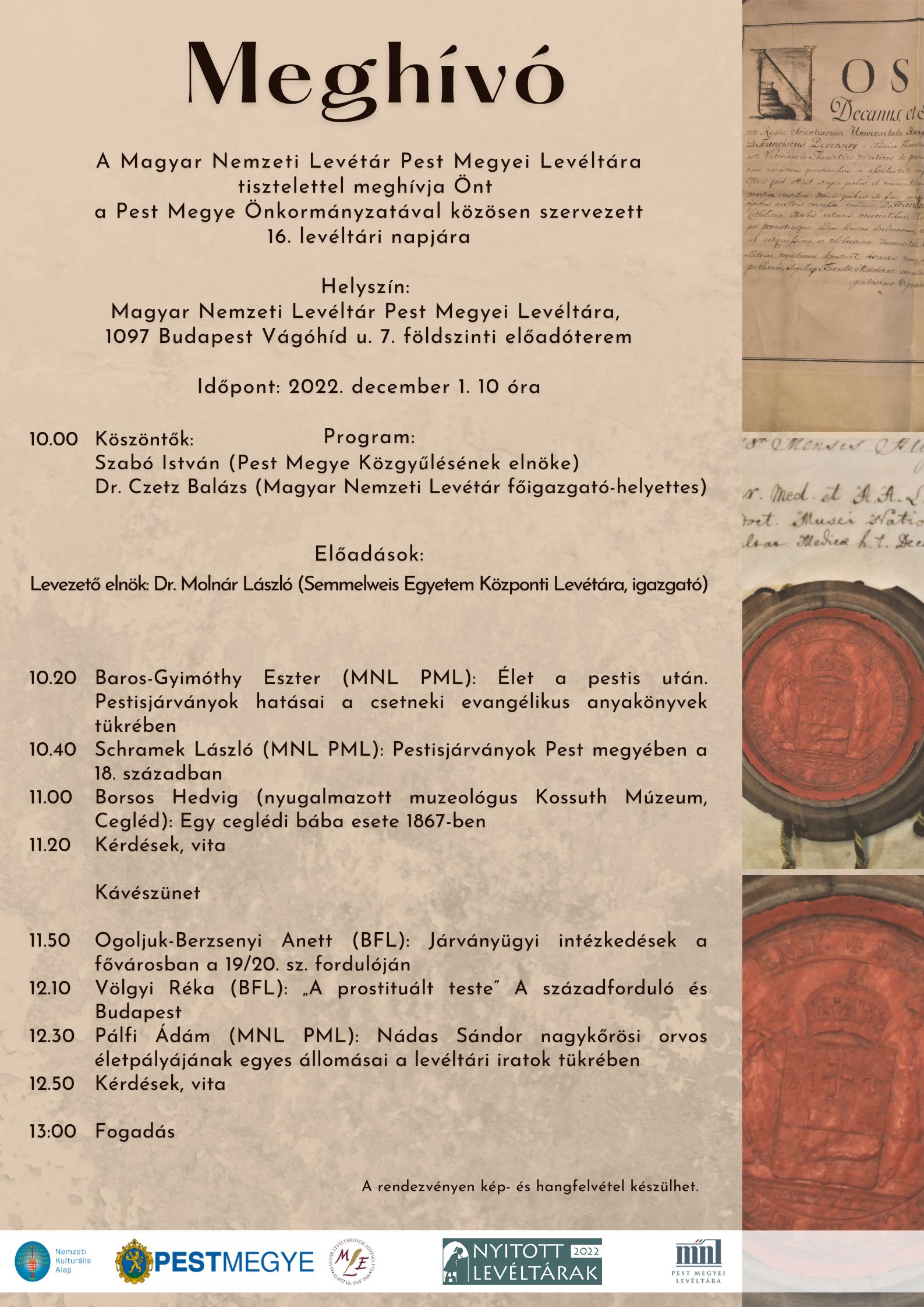Nagy tisztelettel hívunk mindenkit a Magyar Nemzeti Levlétár Pest Megyei Levéltára tizenhatodik, 2022. december 1-jén tartandó levéltári napjára. Az ismeretterjesztő előadások az egészségügy történetének egy-egy fejezetébe nyújtanak bepillantást. Bízunk benne, hogy részvételükkel megtisztelik programunkat.