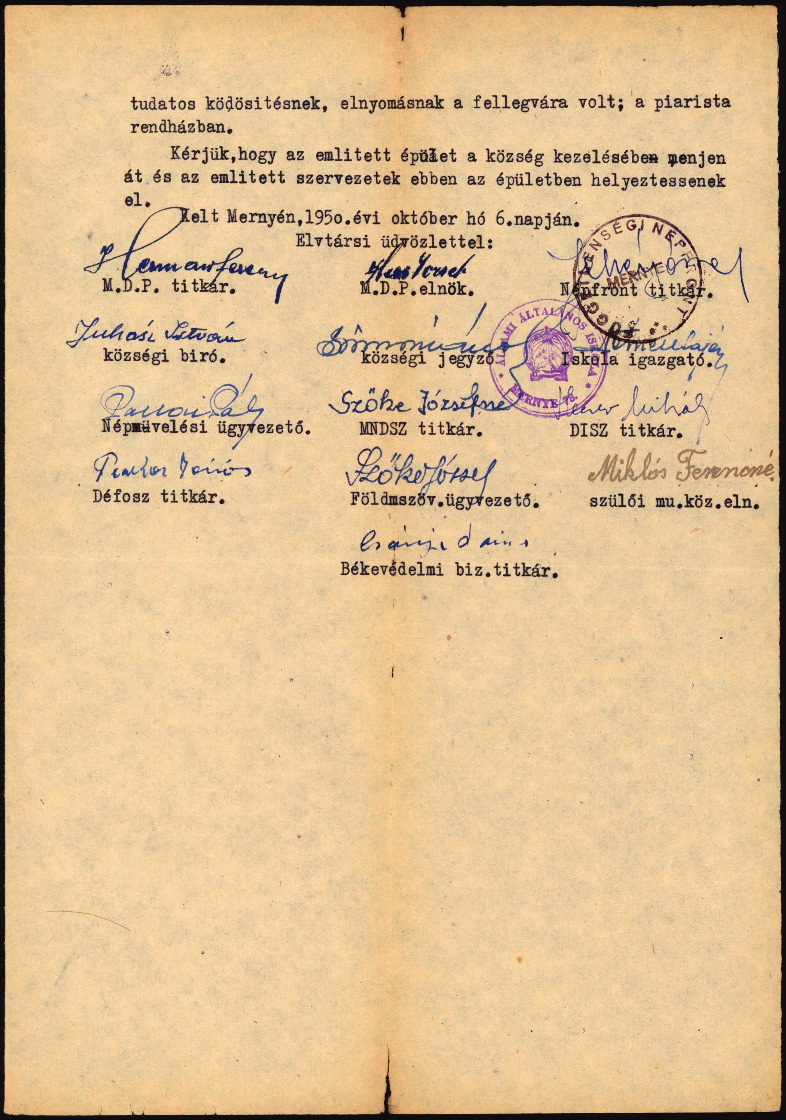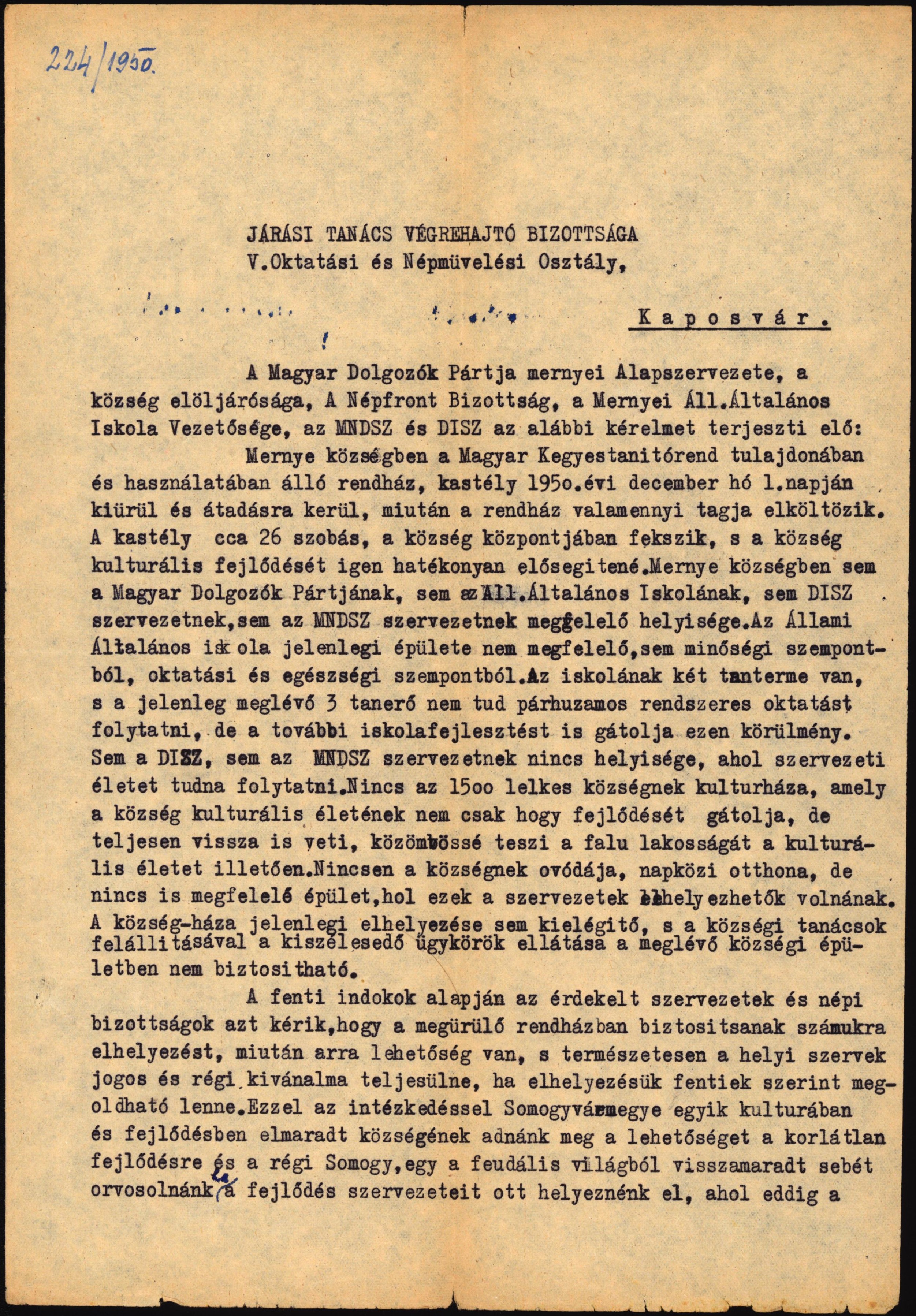 Az állami tulajdonba került kastélyok és kúriák hasznosítása azonban számos településen meglehetősen nagy problémát jelentett. Mernyén ez hamar megoldódott: az alanti forrásból megtudjuk, hogy a község „népi szervei” igényelték ki azt iskola, illetve a Magyar Dolgozók Pártja (MDP), a Dolgozó Ifjúság Szövetsége (DISZ), a Magyar Nők Demokratikus Szövetsége (MNDSZ) helyi alapszervezete irodahelyisége számára, de a több mint két tucat szobás épületben elhelyezhetőnek gondolták a kultúrotthont, az óvodát, a napközi otthont és a községi tanácsot is. A kérelmezők a Kaposvári Járási Tanács Végrehajtó Bizottsága Oktatási és Népművelési Osztályához juttatták el kérvényüket, amelyet a járás áttett a megyei tanácshoz. Ott feljegyezték a dokumentum hátuljára, hogy a kiigénylés már megtörtént, így az akta irattárba helyezhető. S valóban: egy 1954-ben a megyei tanácson készült kimutatás szerint 1950. december 20-tól a kastély földszintjén a mernyei általános iskola működött, míg az emeleti helyiségekben a kultúrotthont rendezték be, bár közben javasolták a teljes épület iskolai célokra történő hasznosítását (hogy a „népi szervek”, illetve a fennebb felsorolt intézmények is kaptak-e ott helyiséget, arról nem találtunk feljegyzéseket).