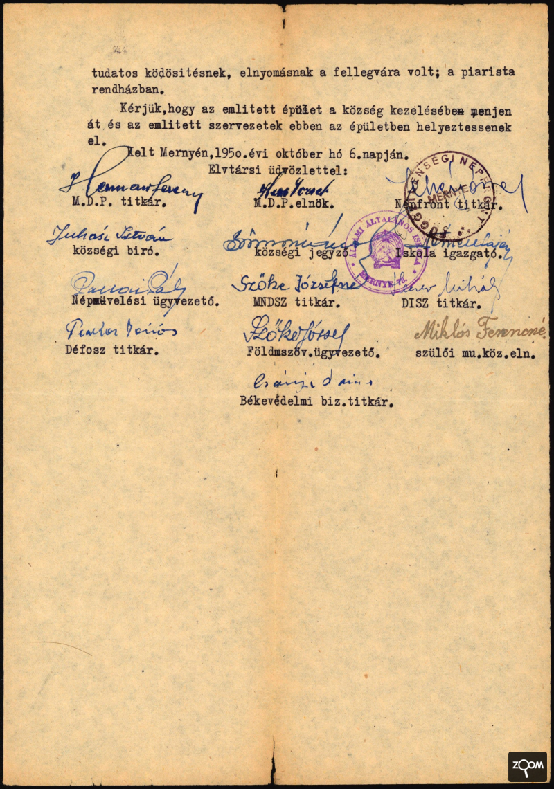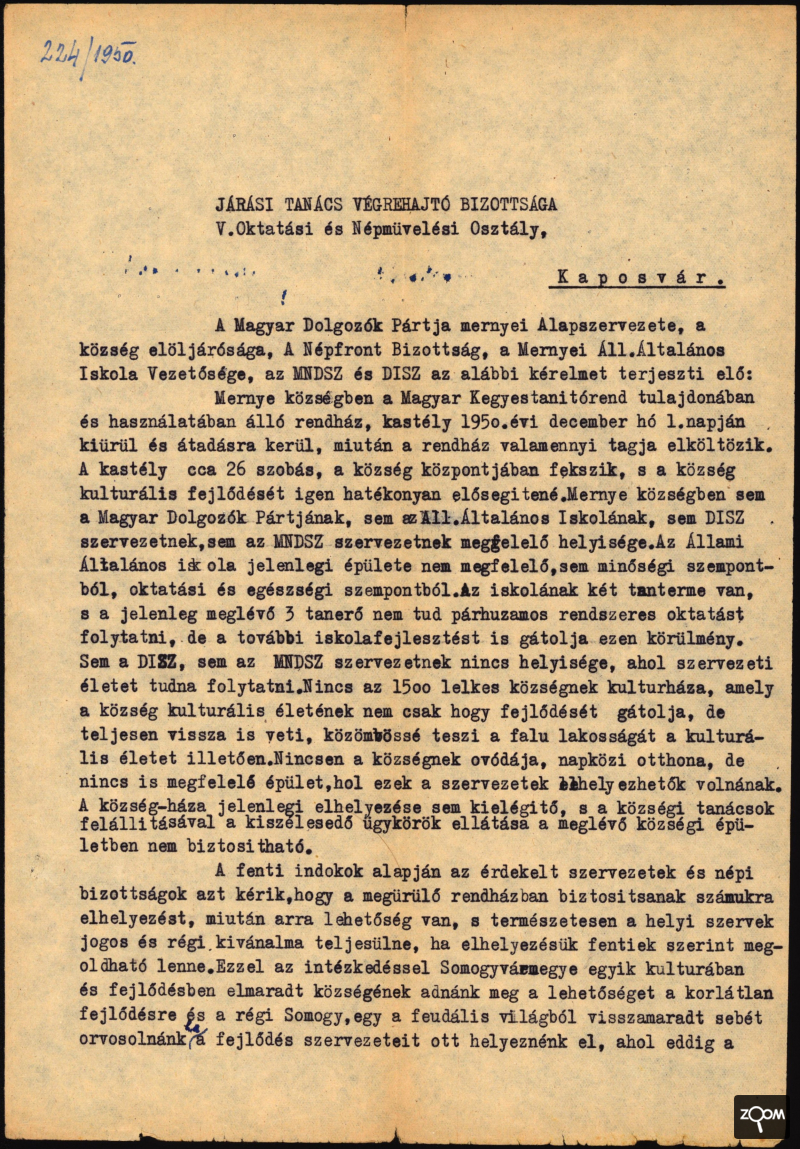 Mernye község „népi szerveinek” kérelme a piarista jószágkormányzói kastély kiutalása iránt