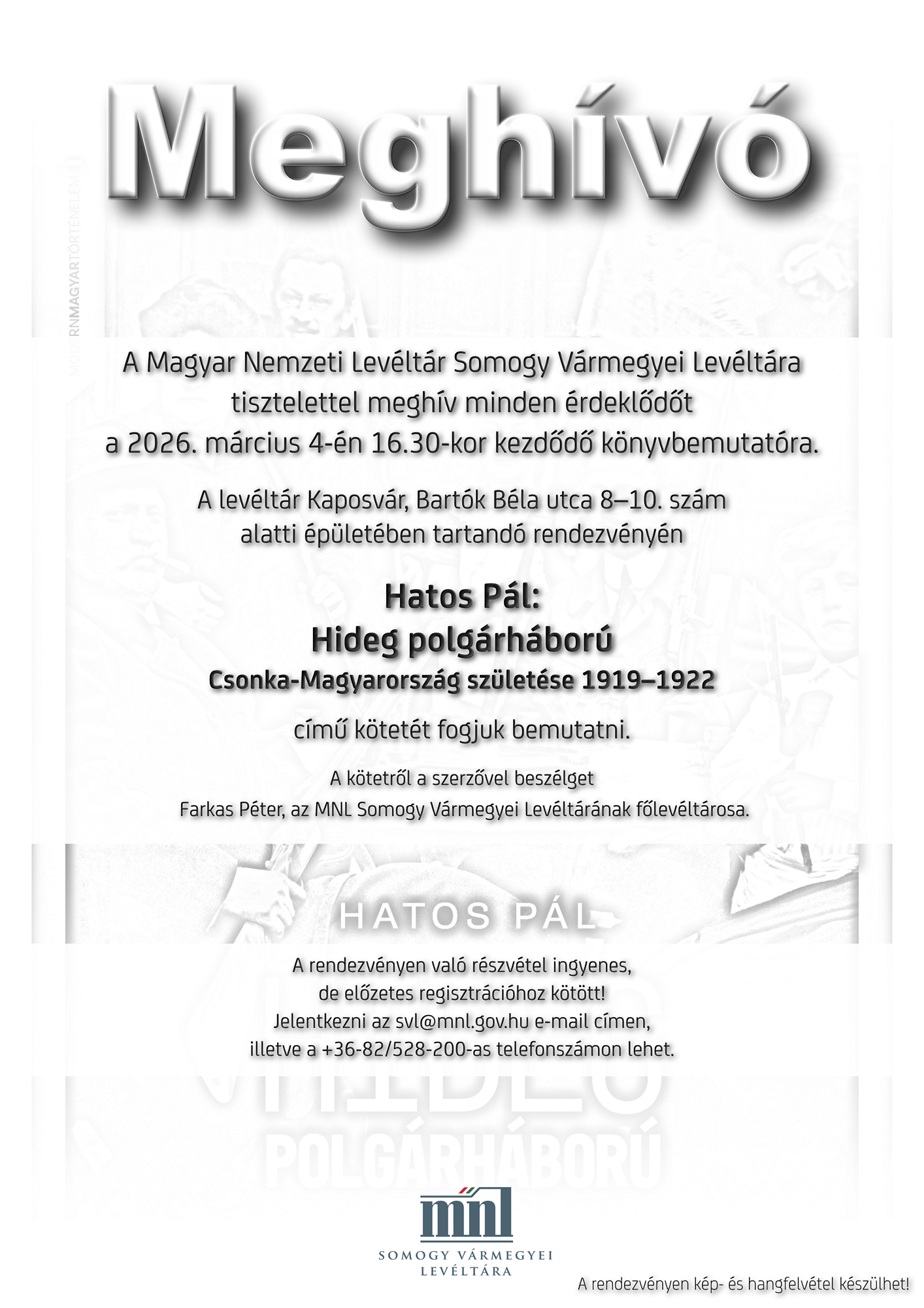 Meghívó Hatos Pál: Hideg polgárháború Csonka-Magyarország születése 1919-1922 című könyv bemutatójára