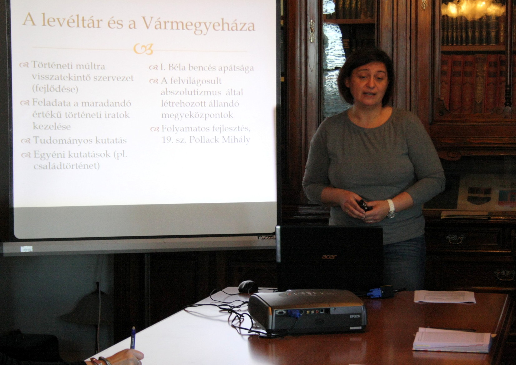 Dr. Máté Andrea adjunktus, tanszékvezető asszony első csoportja a családkutatás témájával foglalkozott: rövid levéltári ismertető után a családkutatás első lépésein keresztül megismerhették az intézményben folyó munkát, kutatási lehetőségeket, A család mint téma az általános iskola első osztályától kezdve minden évfolyamon megjelenik, épp ezért tartották fontosnak a hallgatók ennek a kérdéskörnek a levéltári forrásokon alapuló vizsgálatát. A levéltárban eltöltött idő bizonyította, hogy a családkutatás mindig