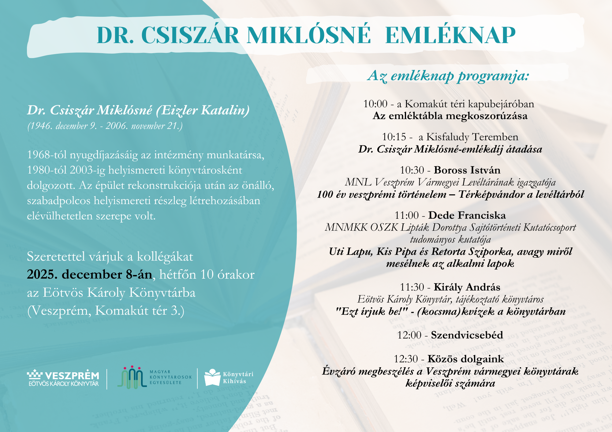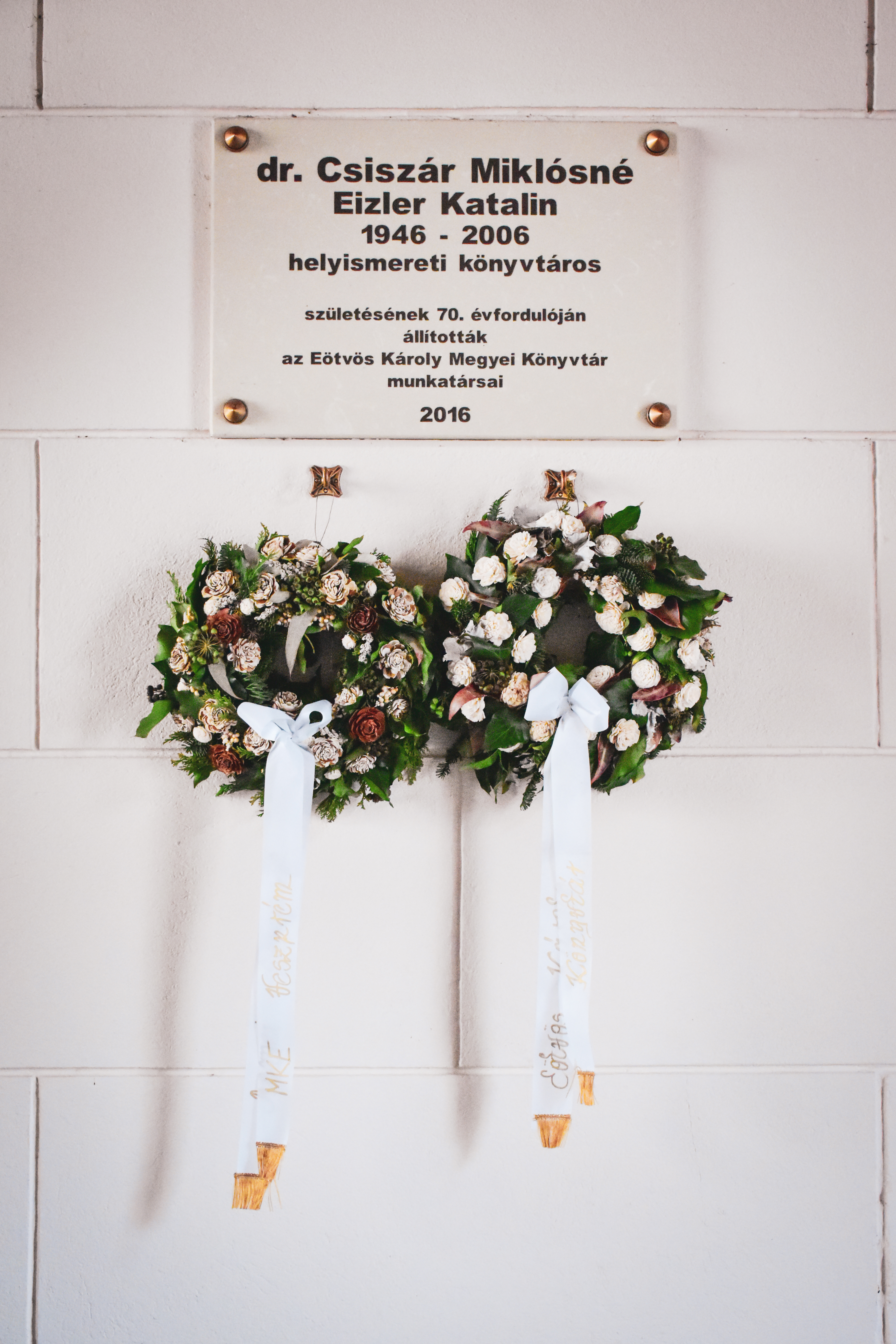A rendezvény az Eötvös Károly Könyvtár kapubejárójának falán elhelyezett emléktábla megkoszorúzásával kezdődött. Majd a rendezvény résztvevőit a Kisfaludy-teremben Dr. Baranyai Tamás igazgató köszöntötte. A Dr. Csiszár Miklósné-emlékdíjat ebben az esztendőben Karika Erzsébet nyugalmazott balatonfüredi könyvtárosnak adta át Dr. Csiszár Miklós, a díj alapítója. A 2016-ban alapított díjat a minden év decemberében megtartott emléknapon olyan Veszprém vármegyei aktív és nyugalmazott könyvtárosok kapják, akik szakmai munkájukkal tevőlegesen hozzájárulnak vagy hozzájárultak településük történetének feltárásához.