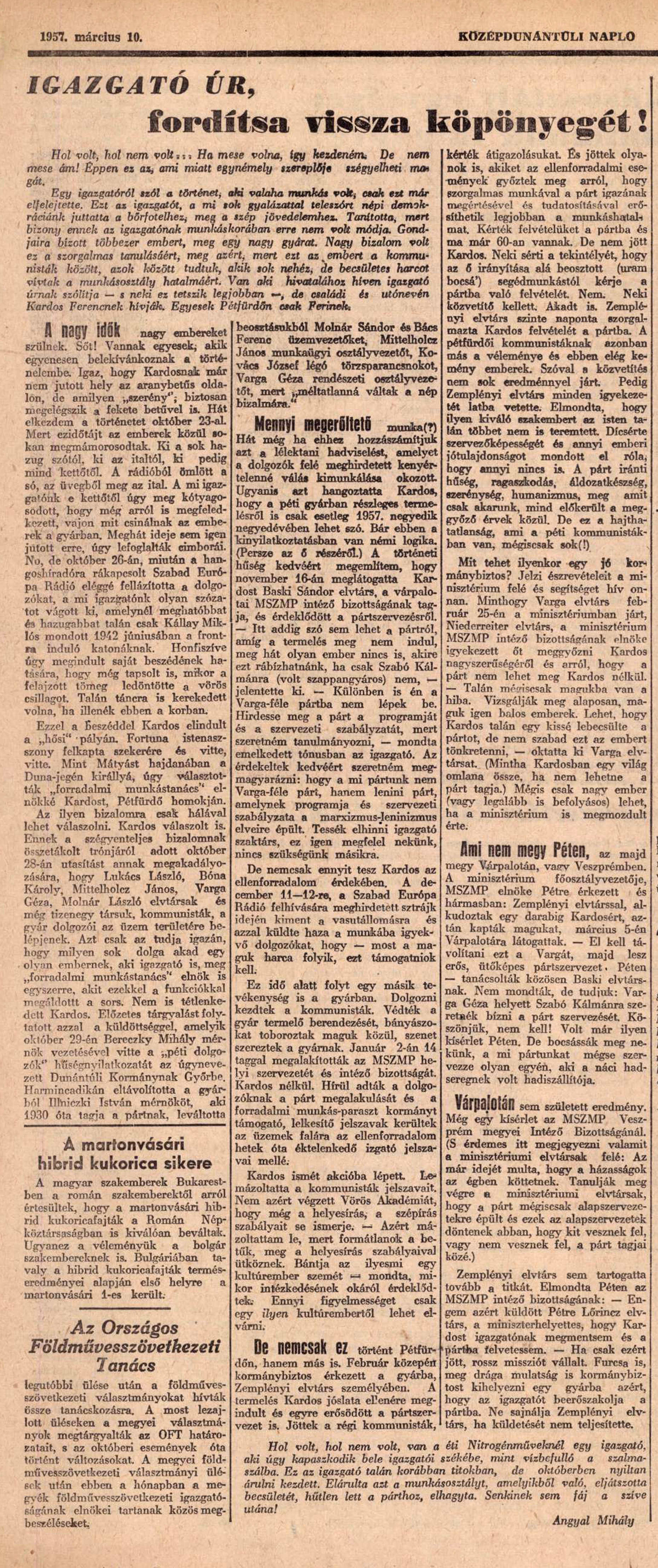 Angyal 1957 = Angyal Mihály: Igazgató úr, fordítsa vissza a köpönyegét! Középdunántúli Napló I. évfolyam (1957) 59. szám (március 10.) 3.