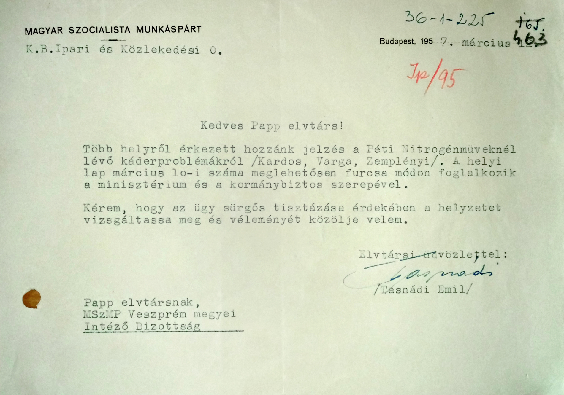 Az igazgató körül kialakulóban lévő helyzet Pétfürdőn, Várpalotán, sőt a megyén túl is terjedt, az MSZMP vezetés felsőbb szintjéig begyűrűzött. 1957. március 12-i keltezéssel Tasnádi Emil a Magyar Szocialista Munkáspárt Központi Bizottság Ipari és Közlekedési Osztályáról írásbeli megkeresést intézett Pap Jánoshoz, aki akkor az MSZMP Veszprém megyei Intéző Bizottságának elnöki tisztét töltötte be, majd később mint a Bizottság első titkára játszott meghatározó szerepet. Levelében az ügy sürgős kivizsgálását kérte.[3]