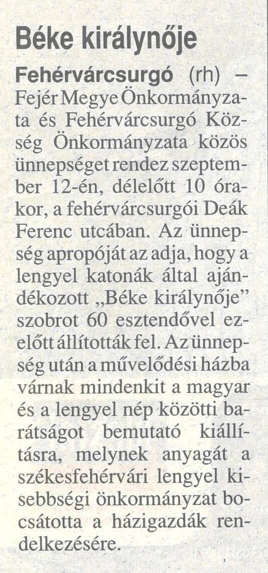 Fehérvárcsurgó II. vh. Béke királynője szobor
