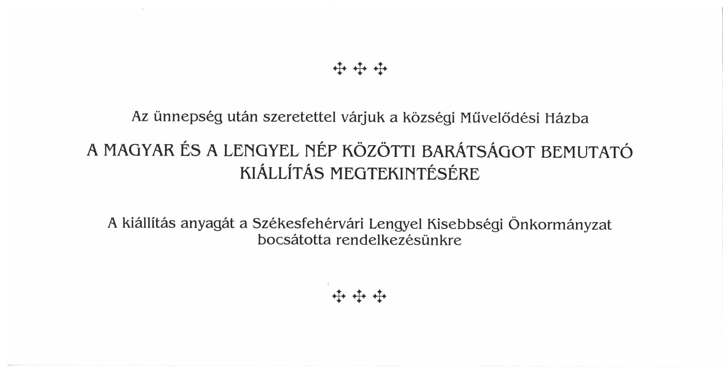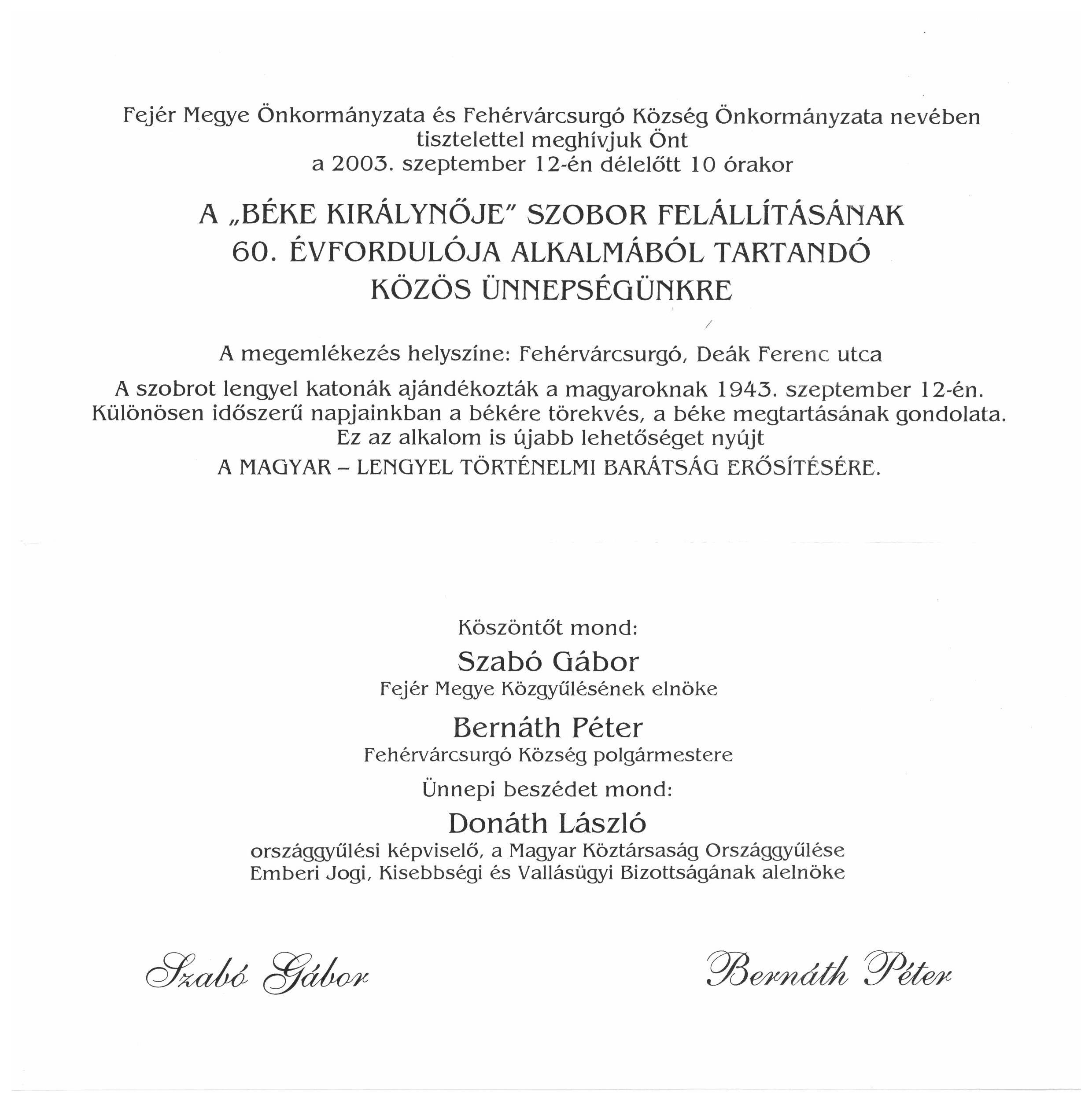 Tíz évvel később, 2003. szeptember 12-re újabb ünnepséget szerveztek, ekkor már a 60. évforduló alkalmából. Bernáth Péter polgármestertől meghívást kapott a megyei önkormányzat, a Lengyel Köztársaság nagykövete, a lengyel testvérmegye marsallja és Szili Katalin, az Országgyűlés elnöke.[4] A település végül a Fejér Megyei Önkormányzattal közös ünnepséget rendezett, és a megemlékezés után a művelődési házba várták az érdeklődőket a magyar és a lengyel nép közötti barátságot bemutató kiállításra, melynek anyagát a székesfehérvári lengyel kisebbségi önkormányzat bocsátotta a házigazdák rendelkezésére.[5]