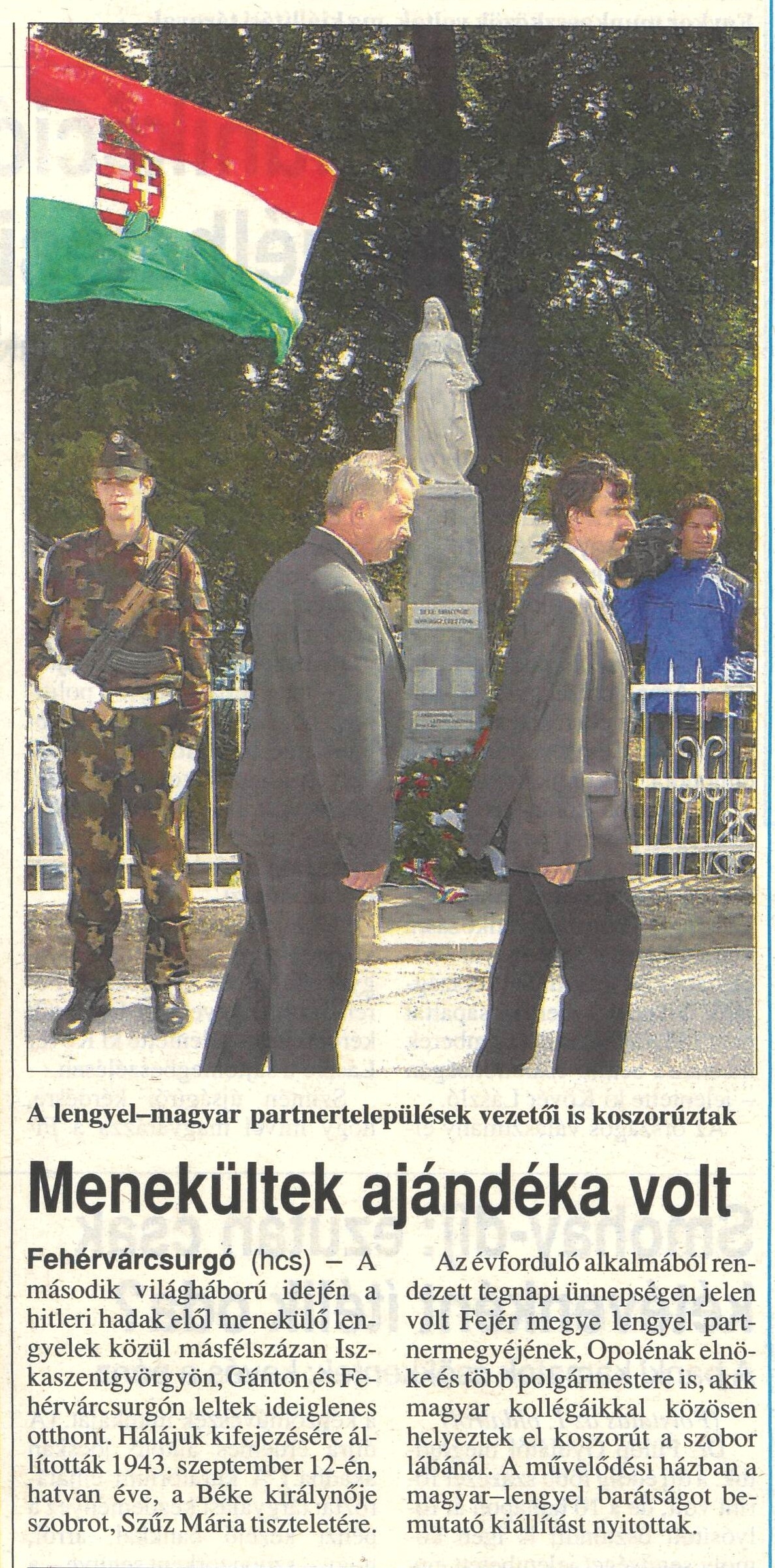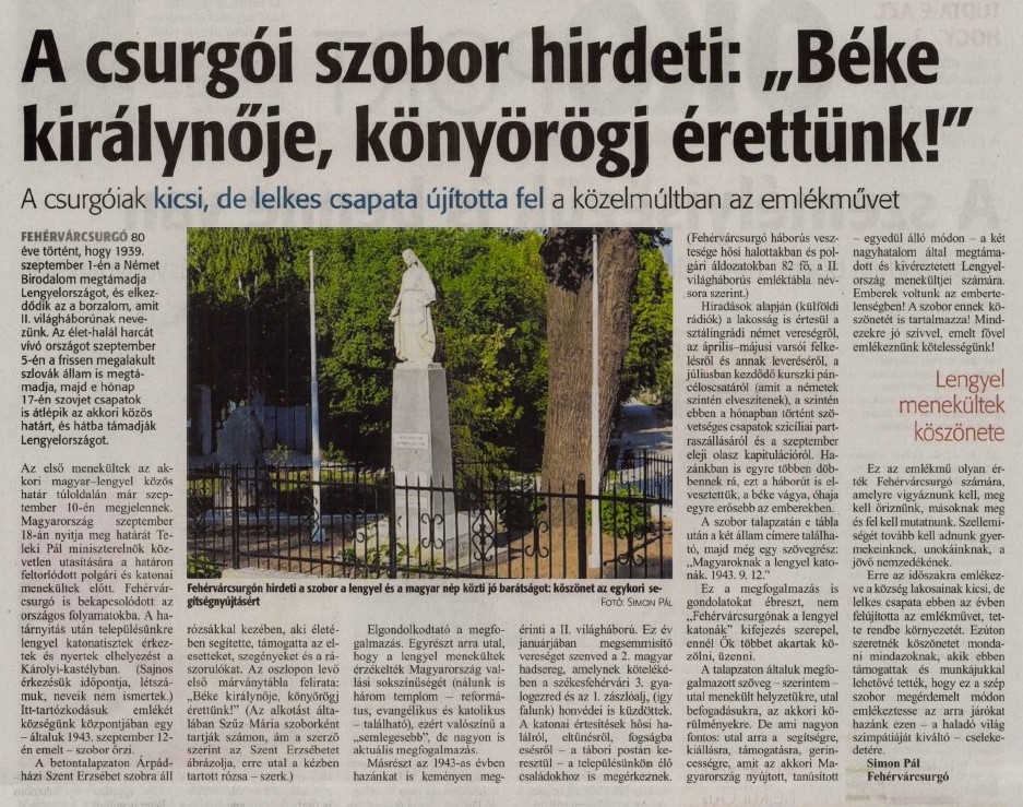 Szovjetunió 1939. szeptember 17-én megindította csapatait a németekkel már háborúban álló Lengyelország ellen, és sok lengyel számára országa elhagyása tűnt a legjobb megoldásnak. 1939. szeptember 18-án Teleki Pál miniszterelnök utasítására megnyitották a lengyel menekülők előtt a lengyel-magyar határt. A menekültek között egyaránt voltak civilek illetve katonák is, 140 kisebb-nagyobb katonai menekülttábort létesítettek, és Budapesten kívül még további 114 településen szállásoltak el polgári személyeket. A lengyel menekültek gondozása terén a hivatalos állami szerepvállalás mellett jelentős szerep hárult a társadalmi szervezetekre is. Már 1939 szeptemberében létrejött a Magyar-Lengyel Menekültügyi Bizottság gróf Károlyi Józsefné és Szapáry Erzsébet grófnő irányításával.[1] Gróf Károlyi Józsefné támogatásra talált unokaöccse, gróf Pappenheim Szigfrid személyében, aki az iszkaszentgyörgyi uradalom birtokosa volt. A grófnő kezdeményezését felkarolta a Magyar Bauxitbánya Részvénytársaság is; a gánti és az iszkaszentgyörgyi bauxitbányák vezetői késznek mutatkoztak a lengyel menekültek alkalmazására. A három település lengyeljeinek szellemi, felekezeti központja Fehérvárcsurgó volt. Hálájukat azzal fejezték ki a község lakossága előtt, hogy 1943. szeptember 12-én szobrot emeltek, amelynek talpazatát a „Béke királynője könyörögj érettünk!" felirattal látták el.[2] Az alkotást általában Szűz Mária szoborként tartják számon.